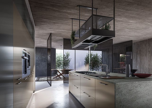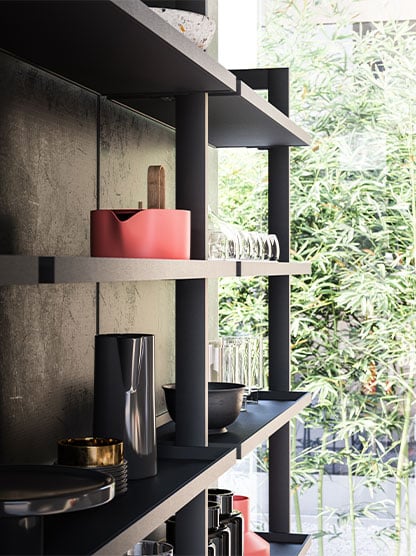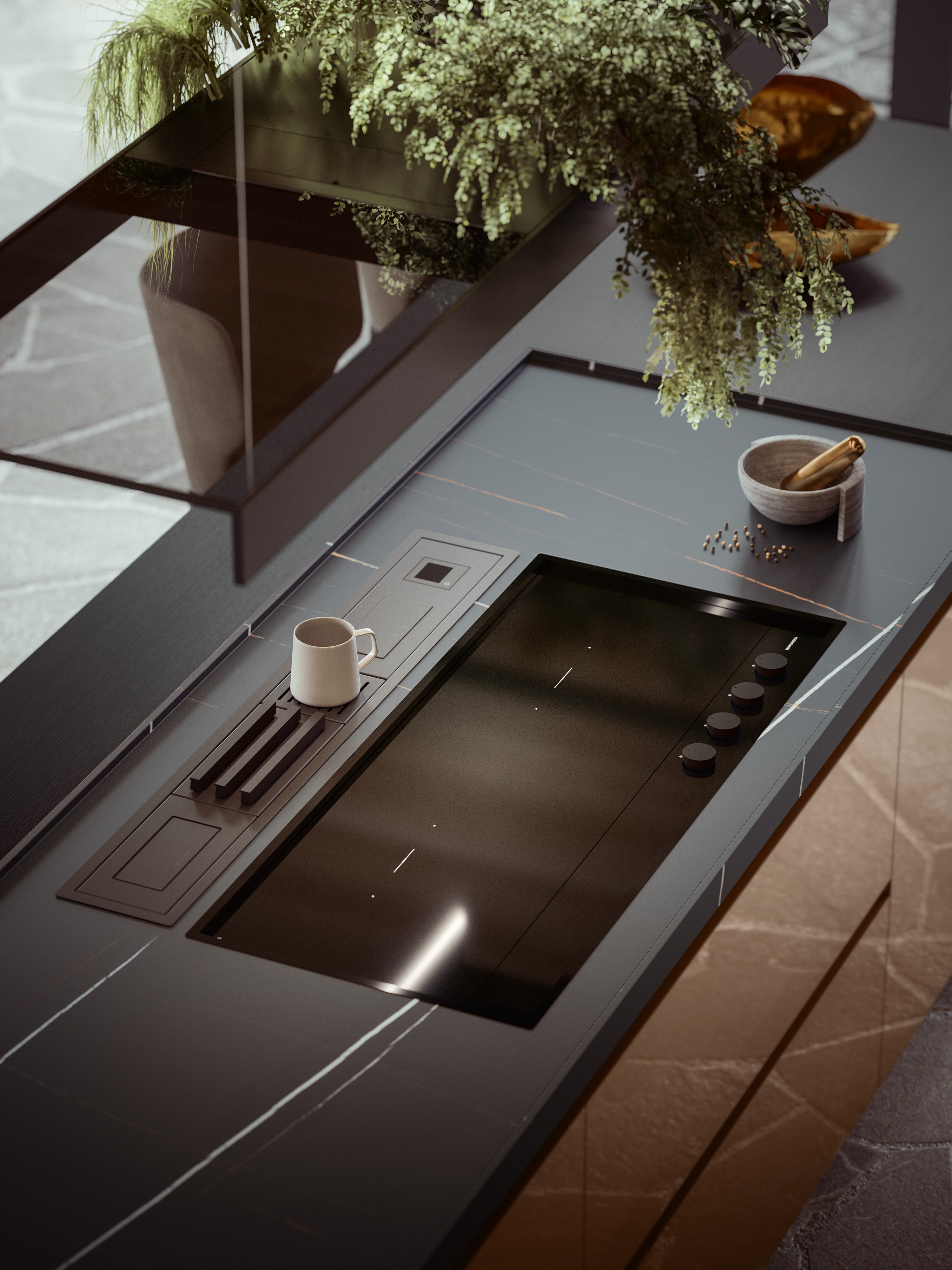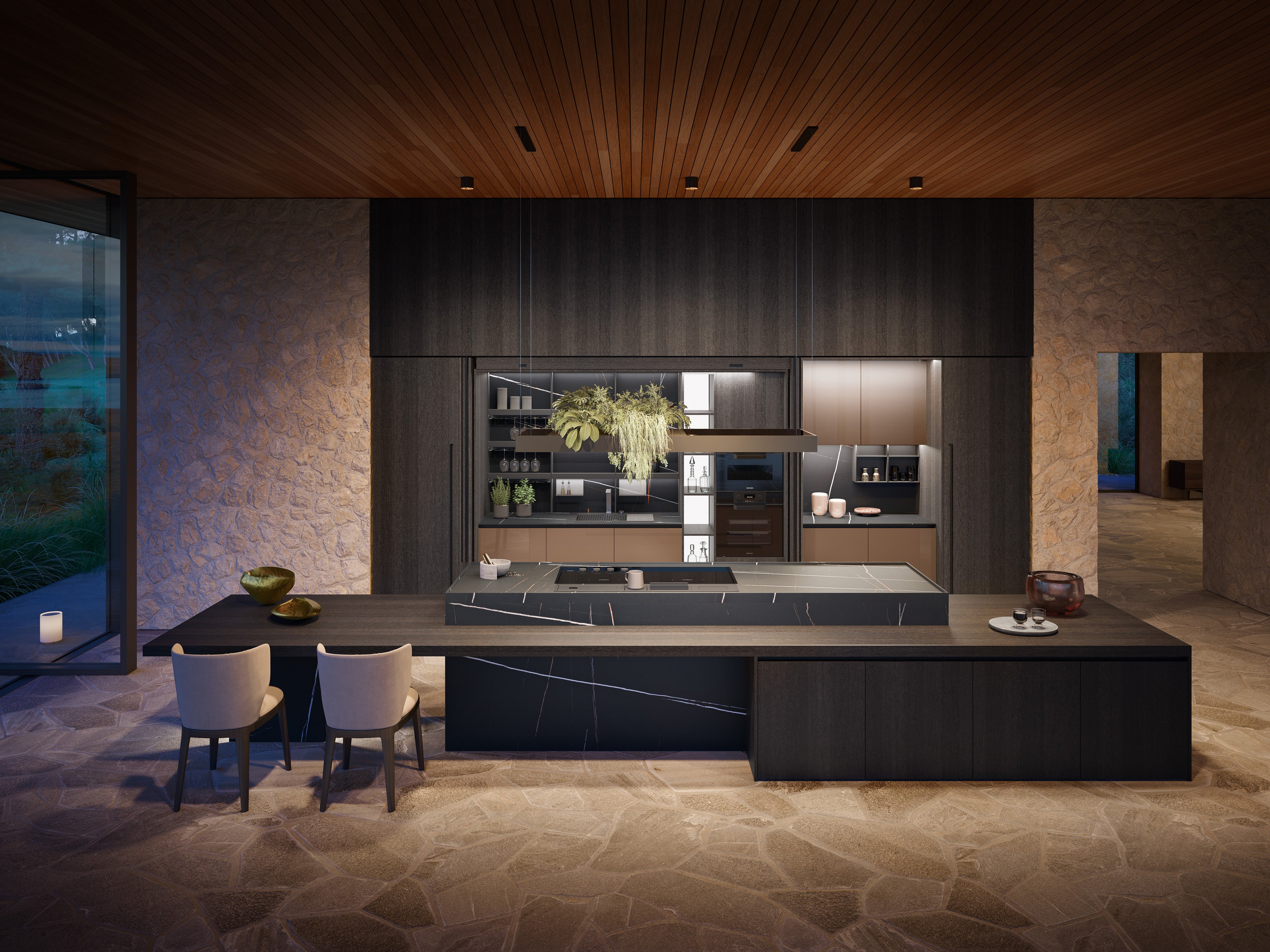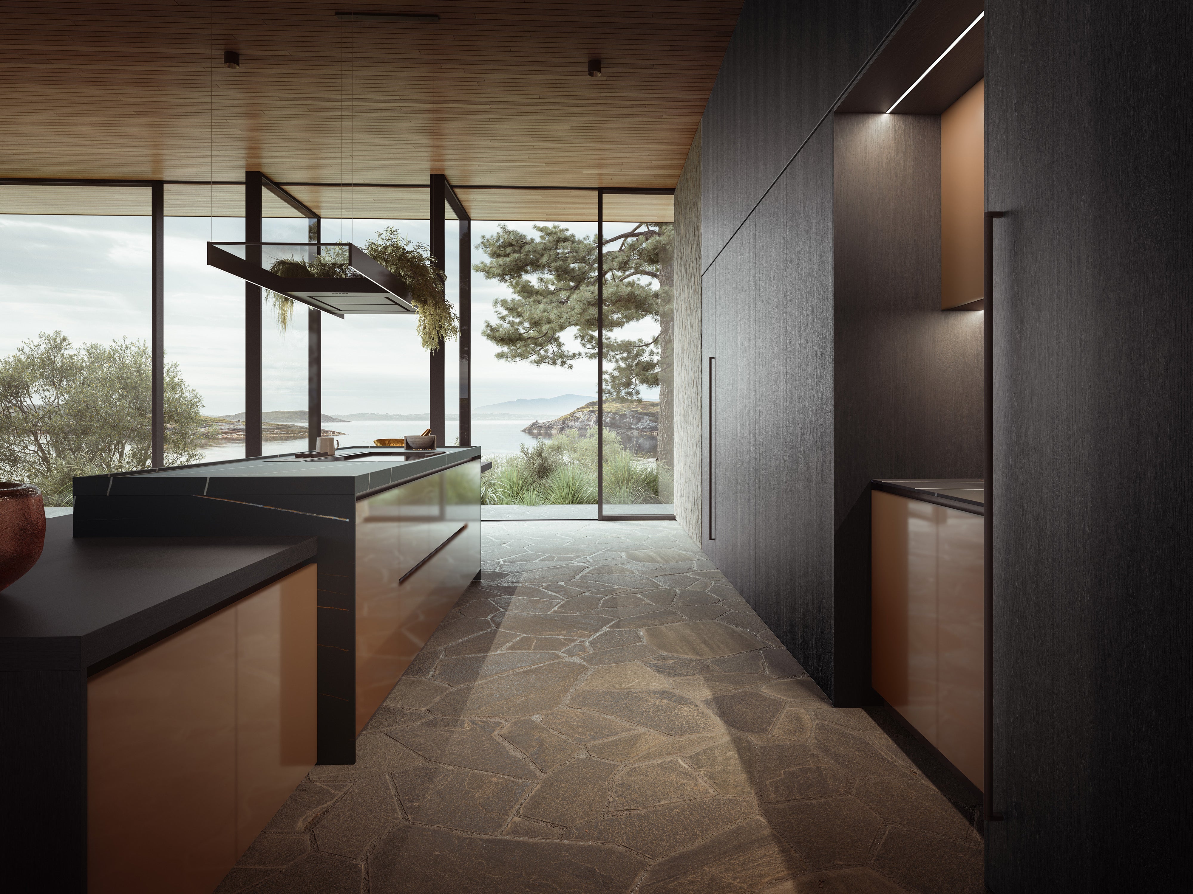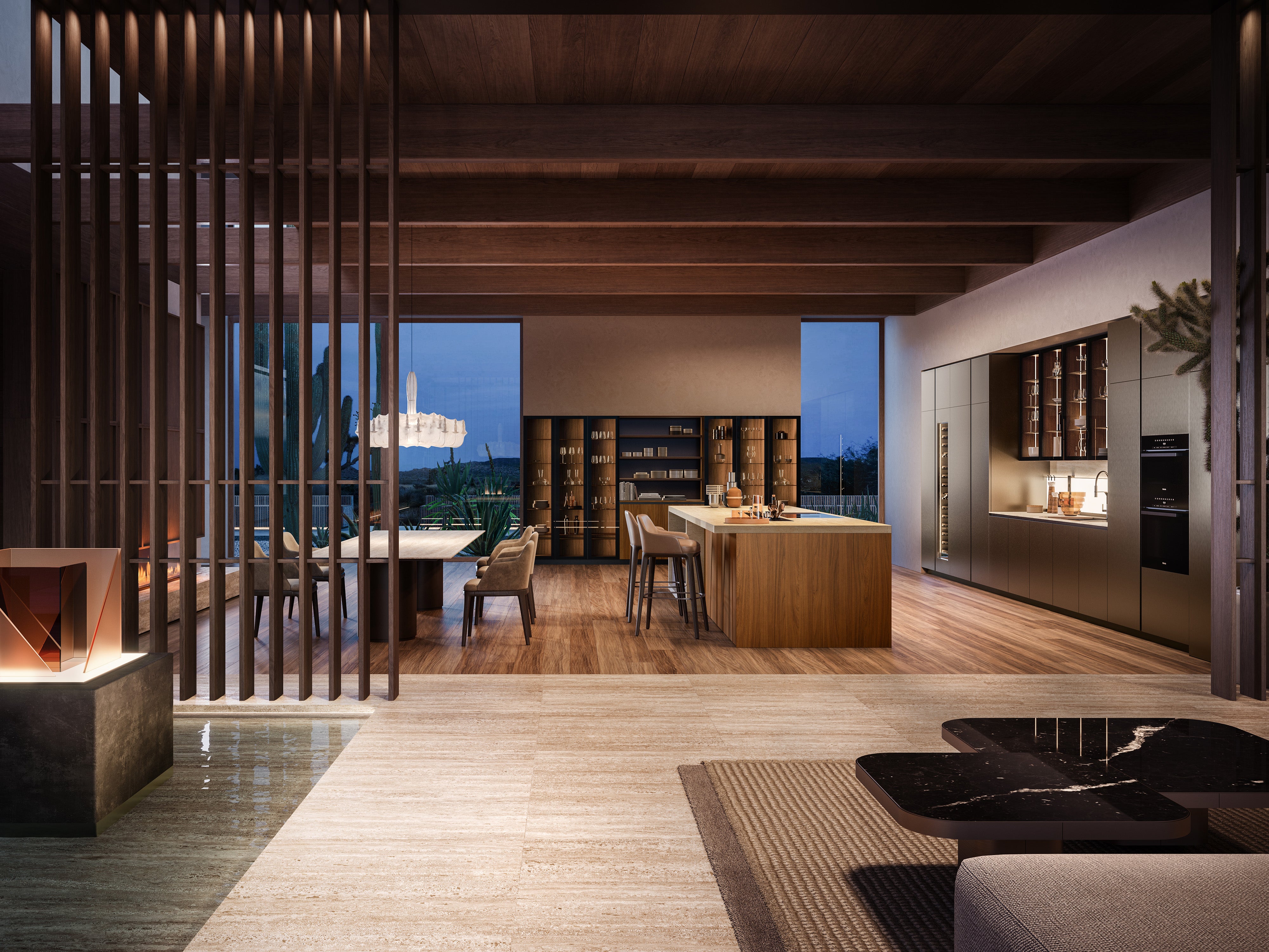 O bucătărie caldă, însorită, care comunică cu exteriorul. Utilizarea furnirului de lemn Noce și a metalului lacuit Ambra, cu suprafața sa nervură și mânerul Zeta integrat în ușă, evidențiază designul esențial, funcțional și armonios al compoziției.