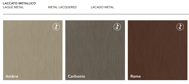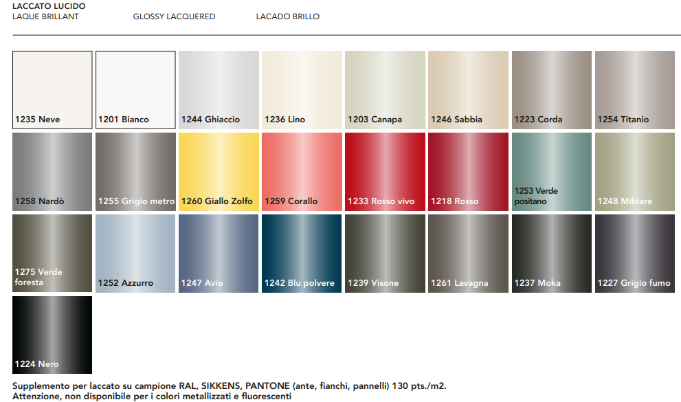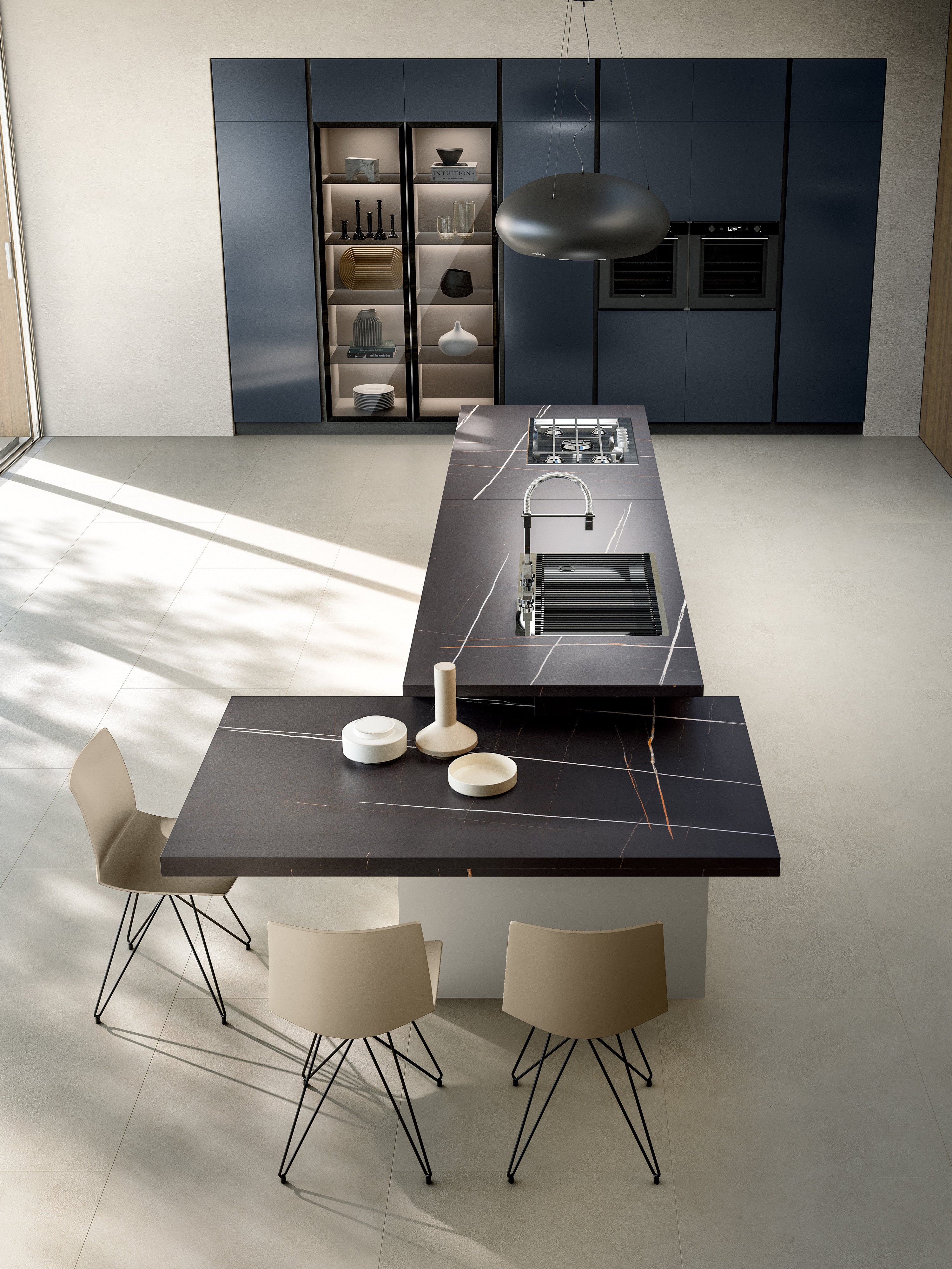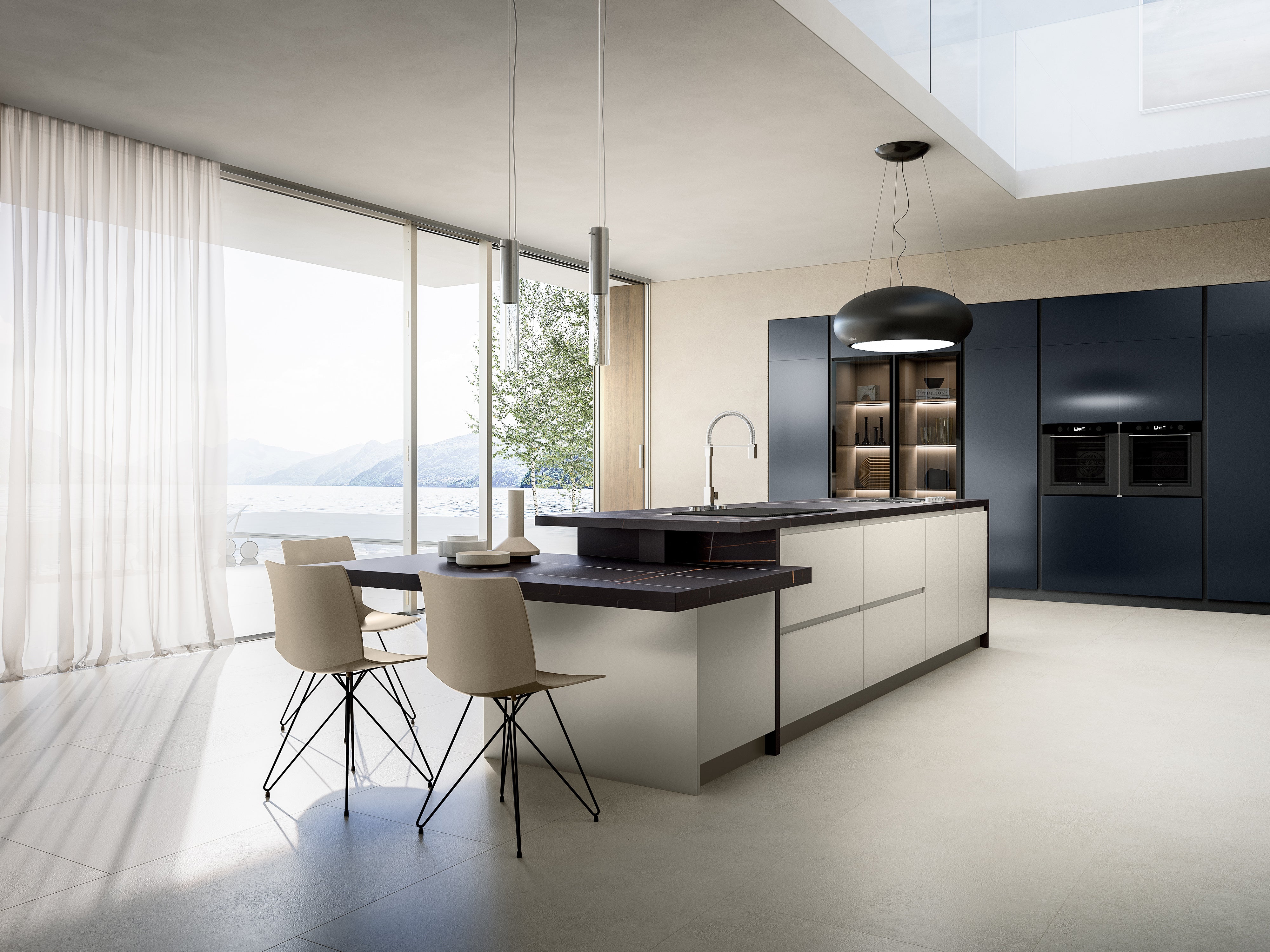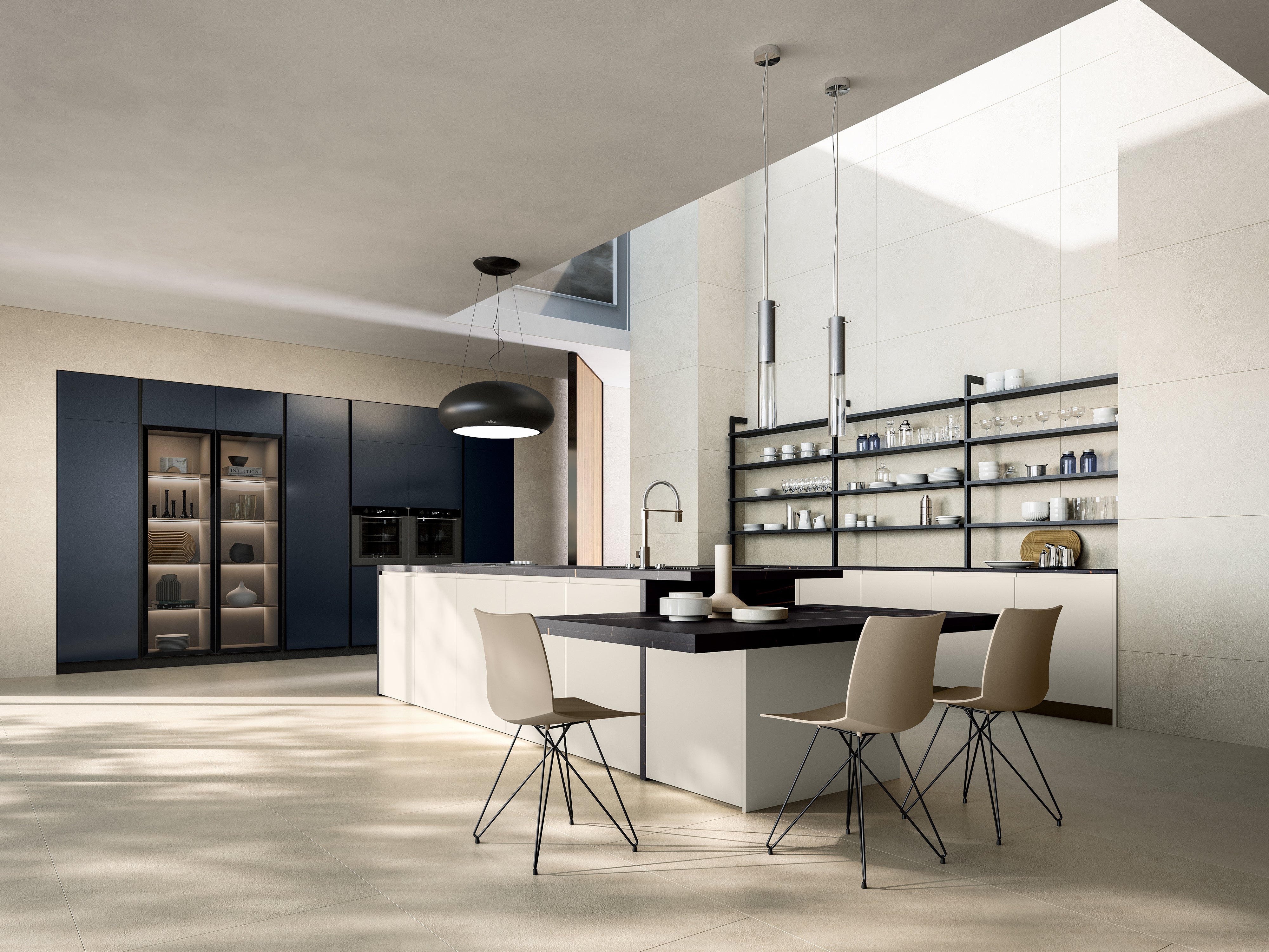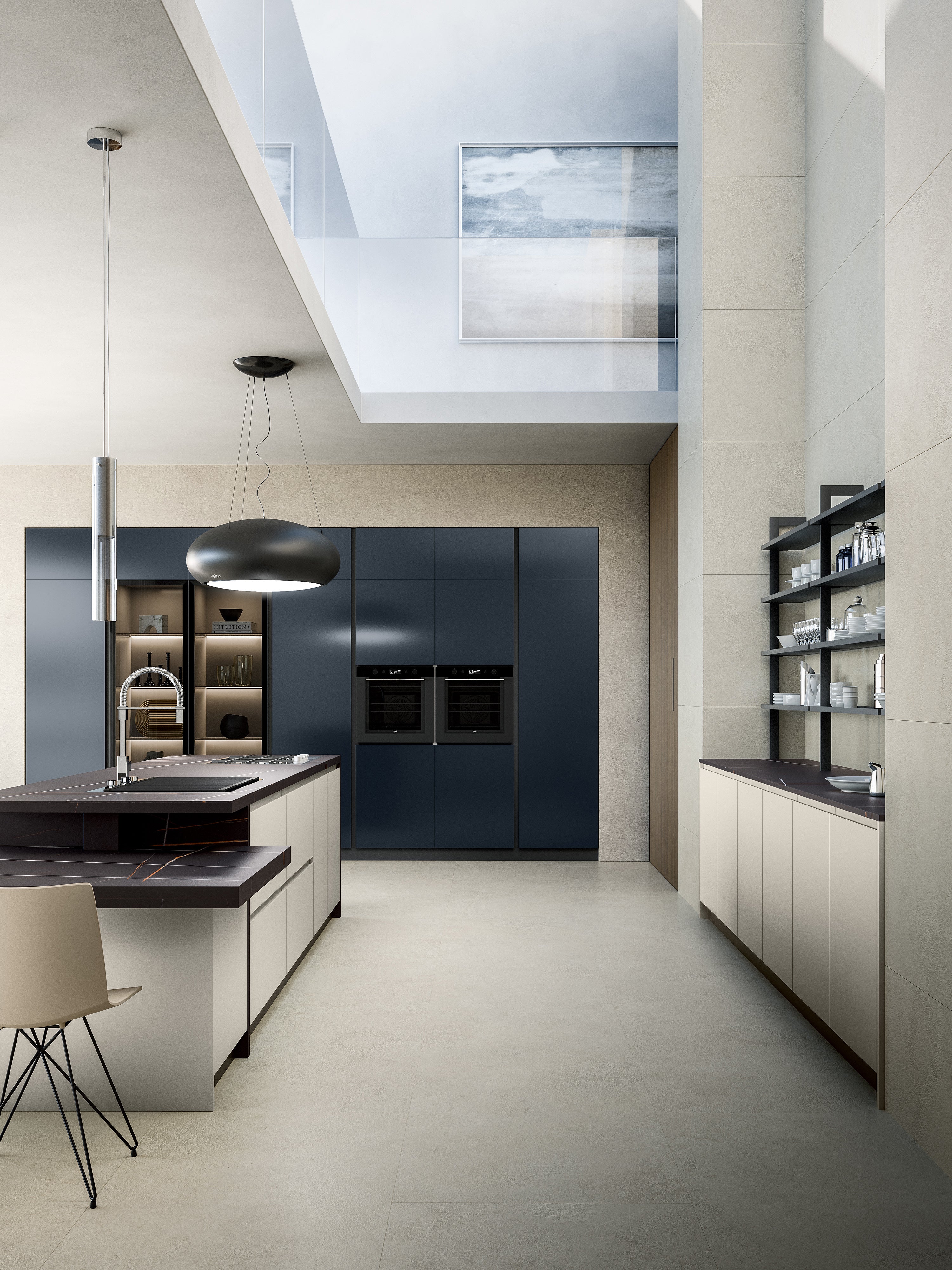 Acest proiect asortează materiale tehnice precum aluminiul și ceramica cu culori vii, sidefate lăcuite Mica. Ușile cu finisaj Talco au mânere Verso integrate cu același finisaj lăcuit Mica, strălucind într-un mediu luminos, cu unități înalte Blu Petrolio și un perete de depozitare din aluminiu anodizat negru Palo.