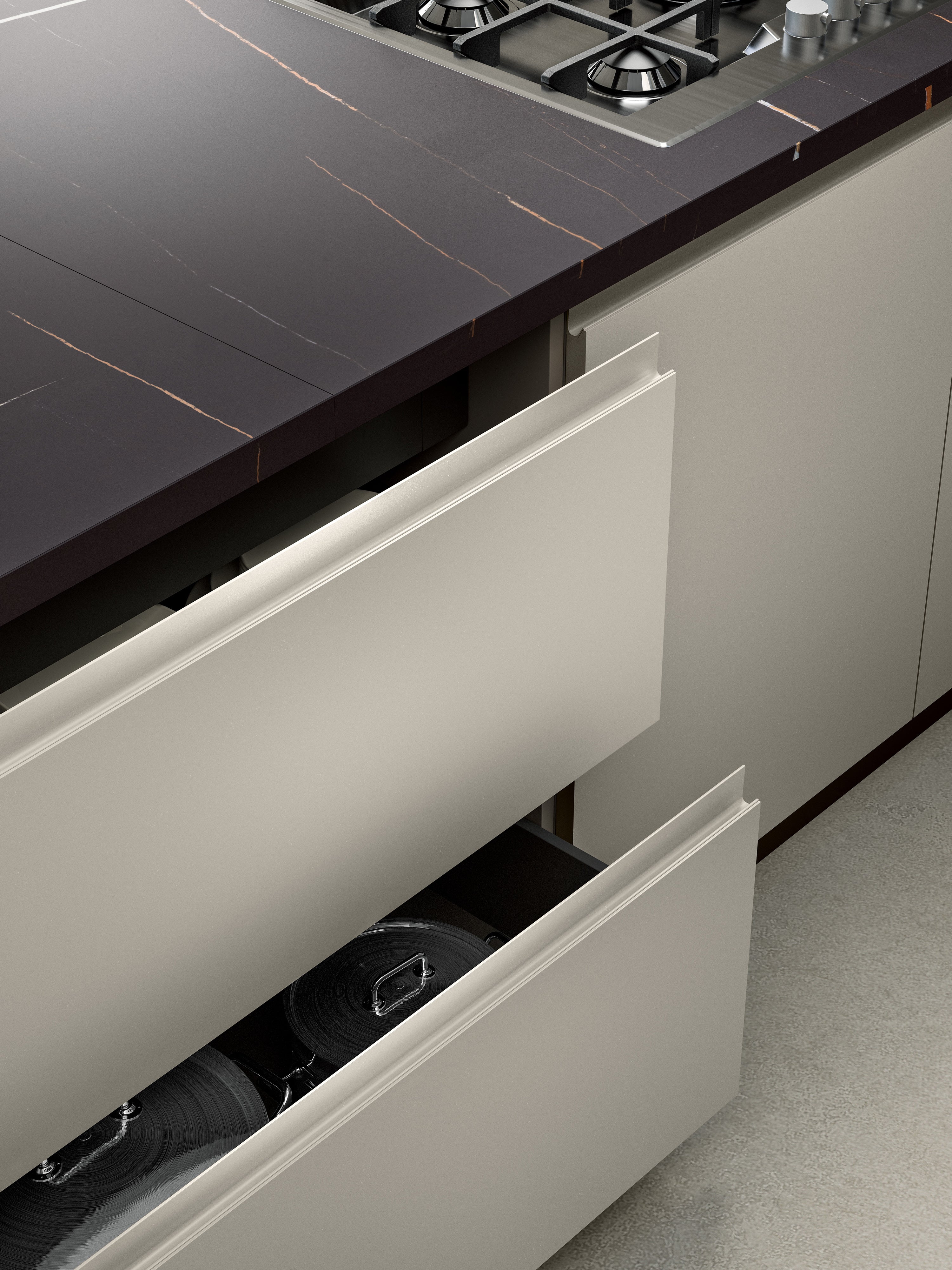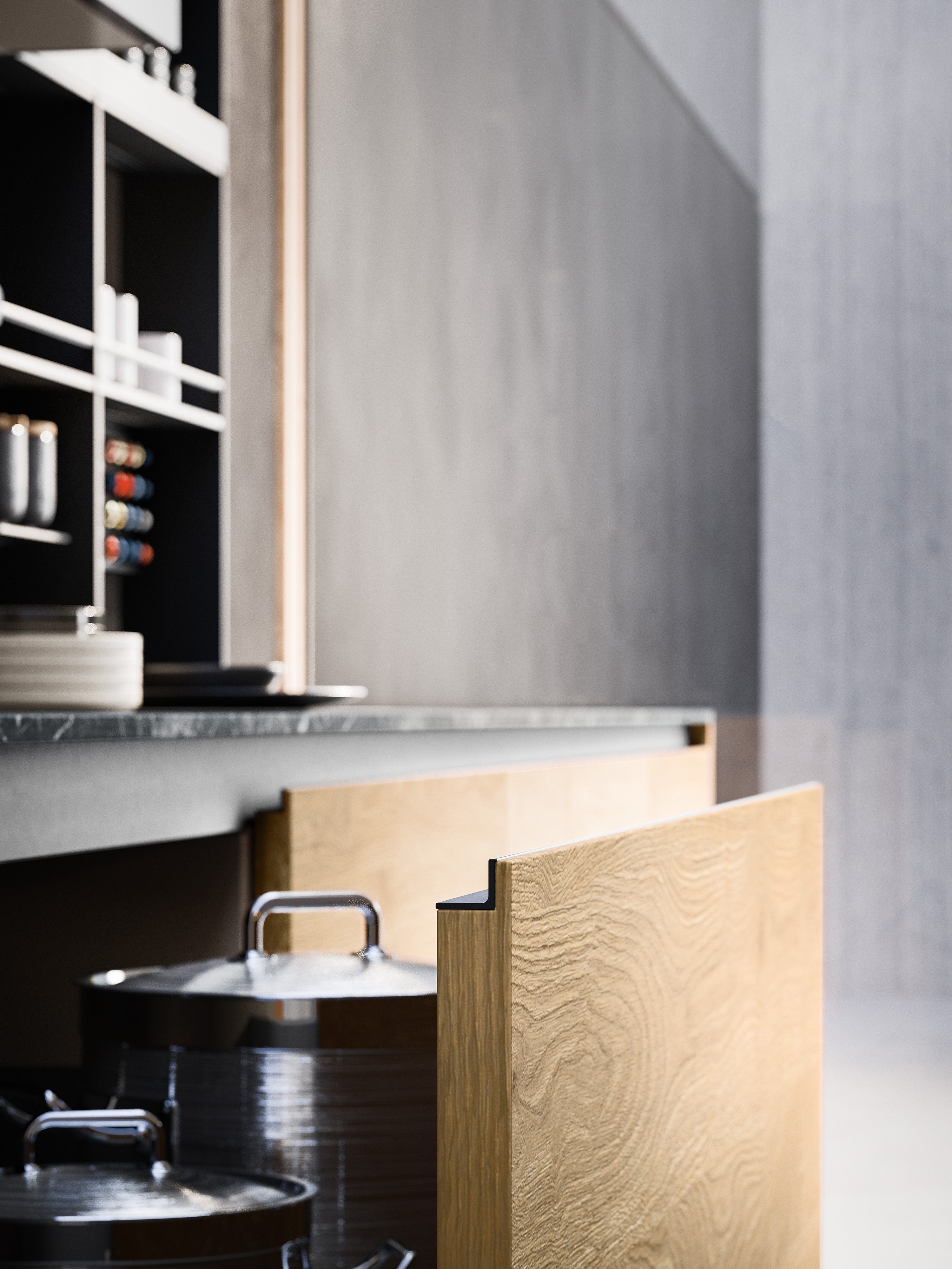 Bucătăria Yota este concepută având în vedere nevoile individuale ale utilizatorului și fiecare detaliu este conceput pentru a-i conduce printr-o călătorie emoțională. Cu ușile sale elegante, cu grosimea de 22 mm, bucătăria devine o trăsătură majoră a casei, îmbunătățită de o gamă largă de materiale, inclusiv furniruri de lemn lucrate cu pricepere, suprafețe lăcuite lucioase și mate, precum și finisaje speciale de lac.