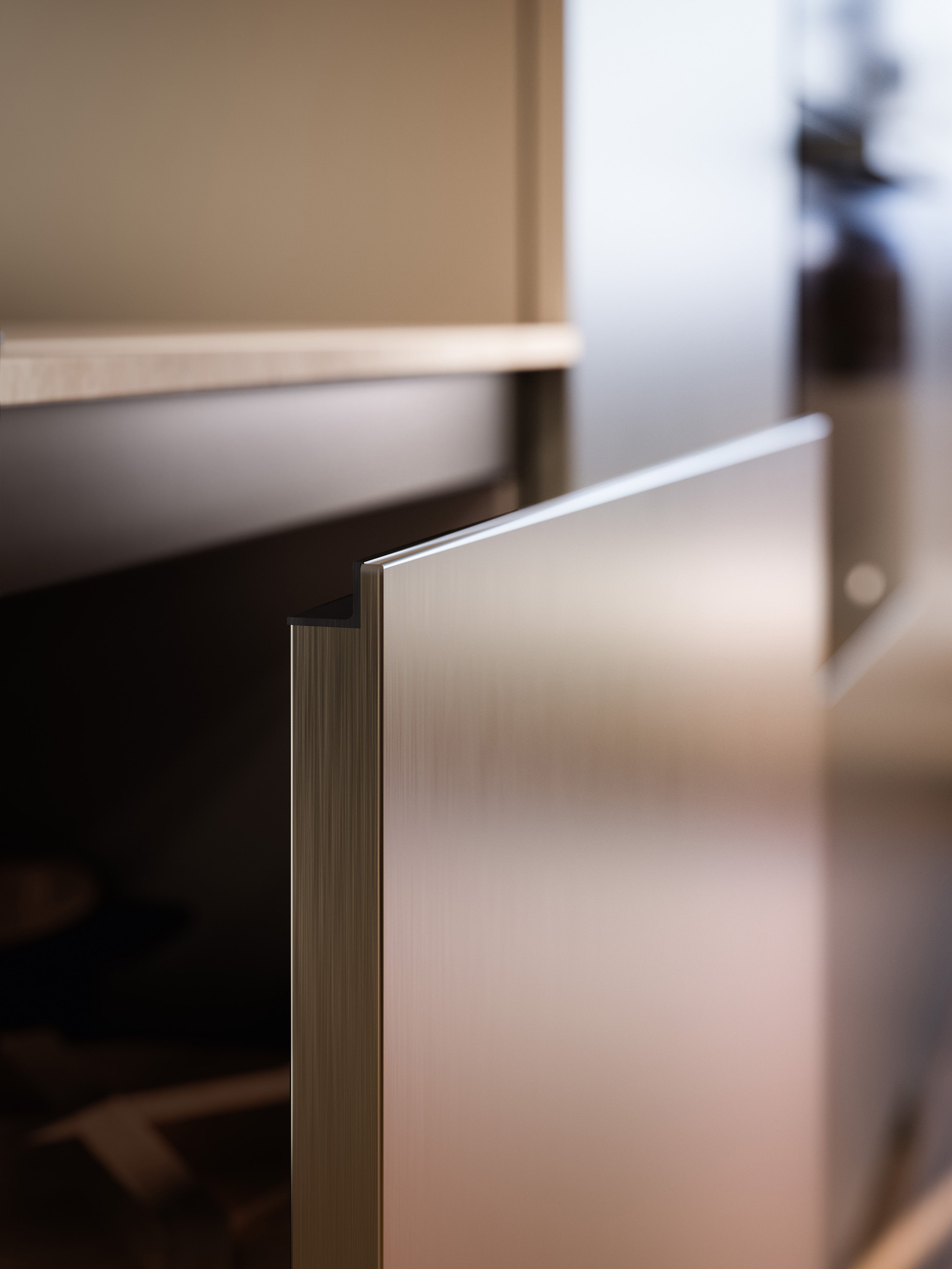 Unitățile înalte din lemn vin cu sistemul Hide, care poate închide sau dezvălui zone întregi de lucru, și finisajul lăcuit Micalux, îmbinând finețea și tehnologia.