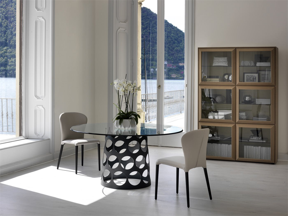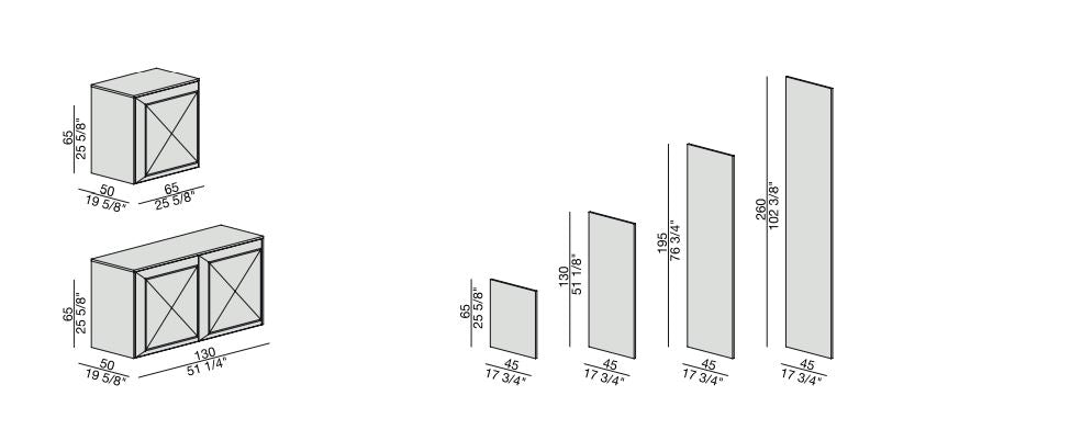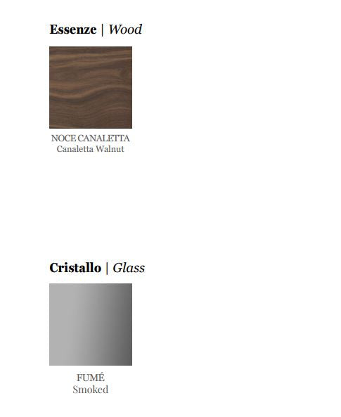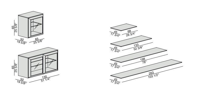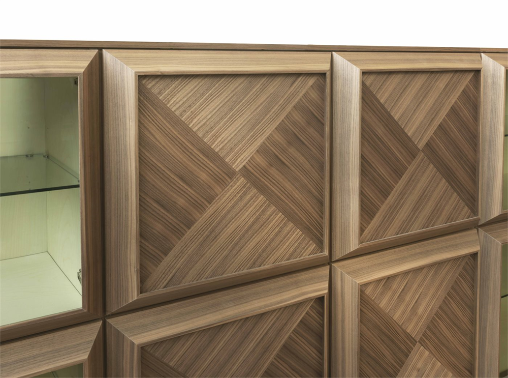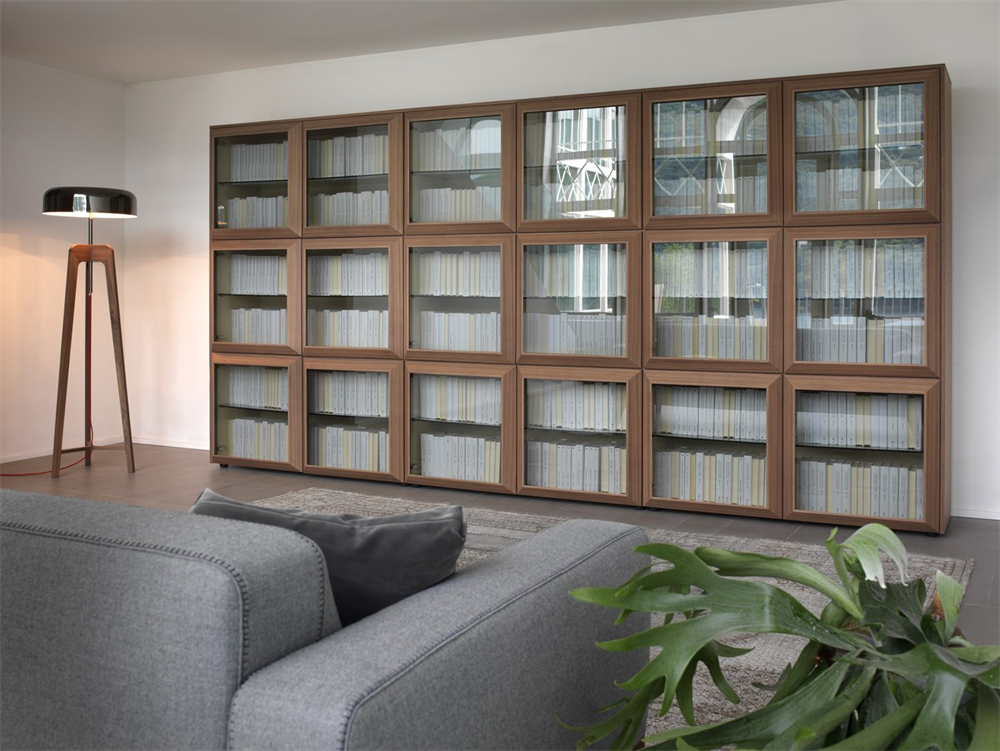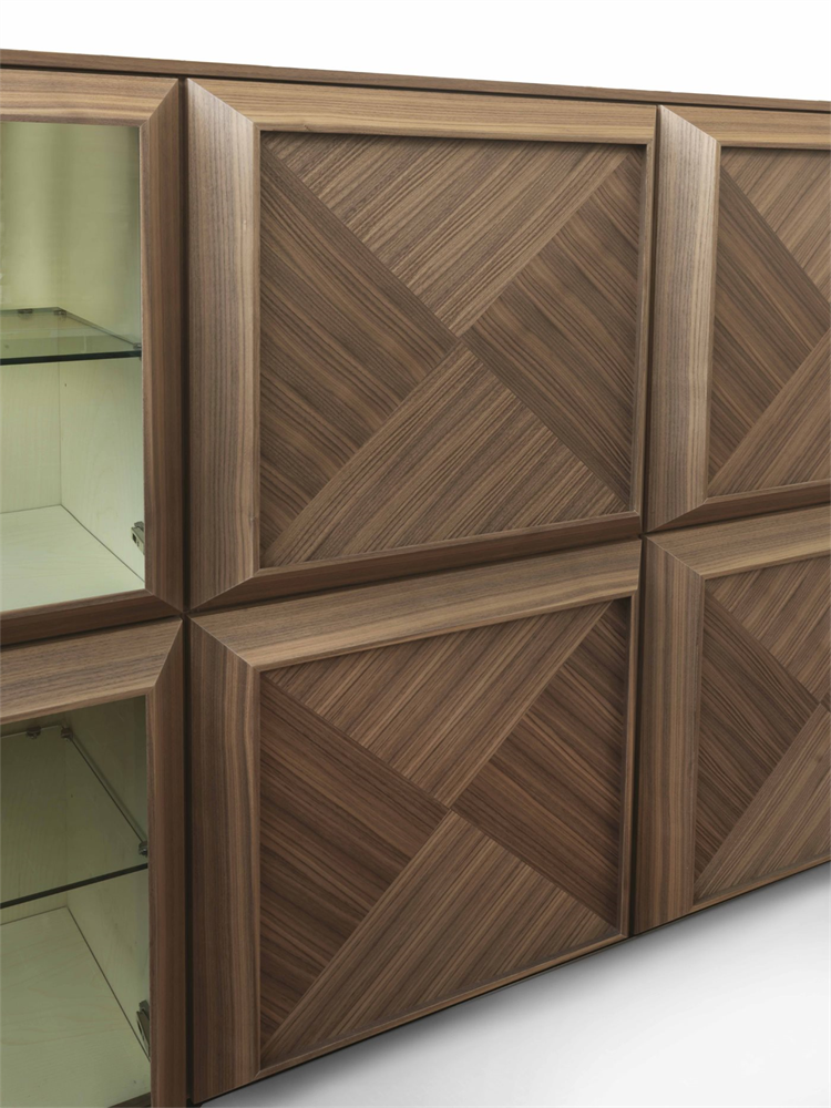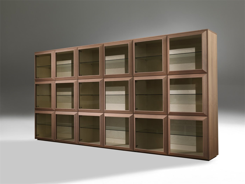 Sistem modular din nuc canaletta cu elemente simple sau cu două fețe cu uși din sticlă sau lemn și elemente de colț cu ușă din sticlă. Interiorul containerului din arțar canadian.