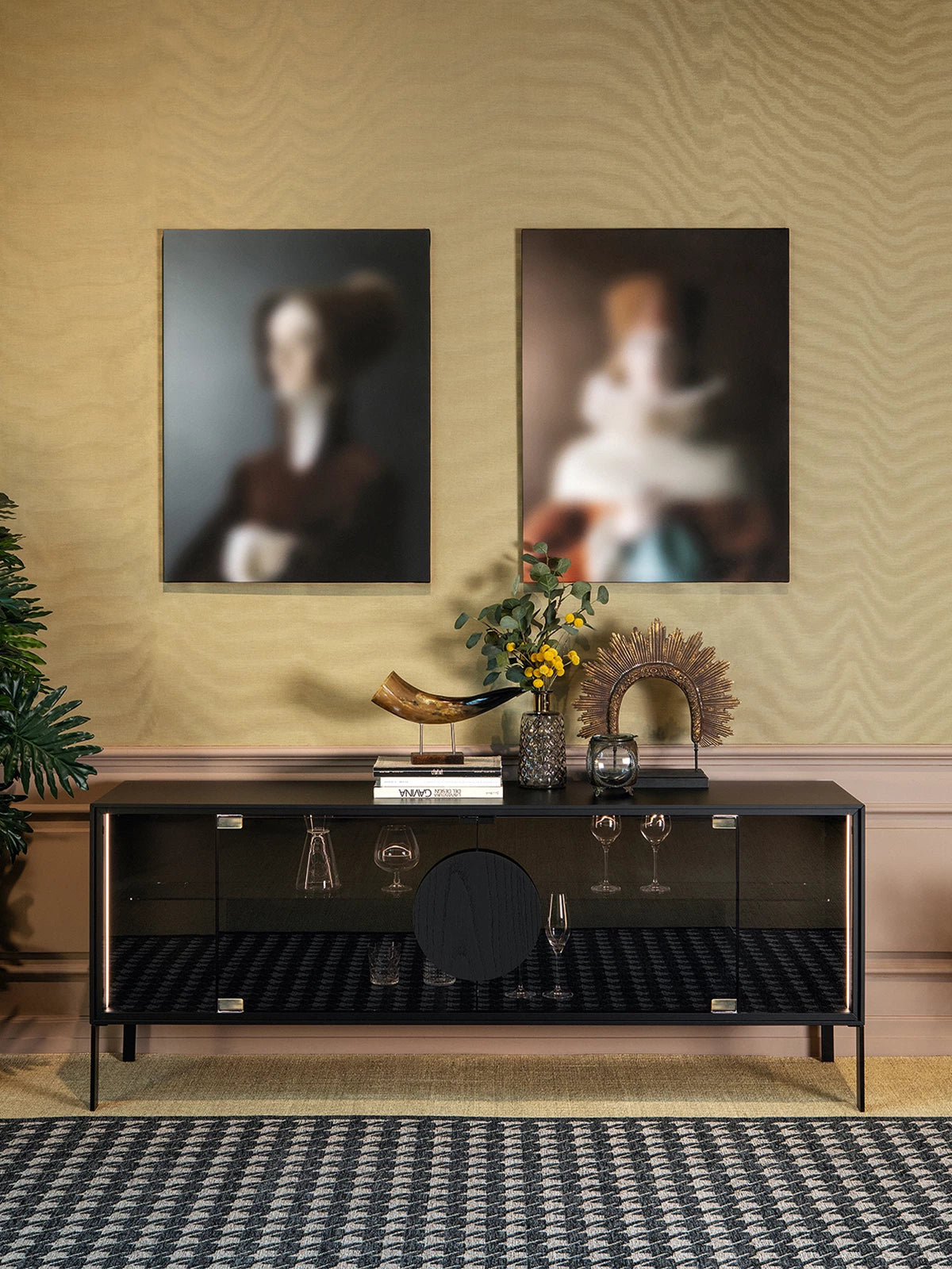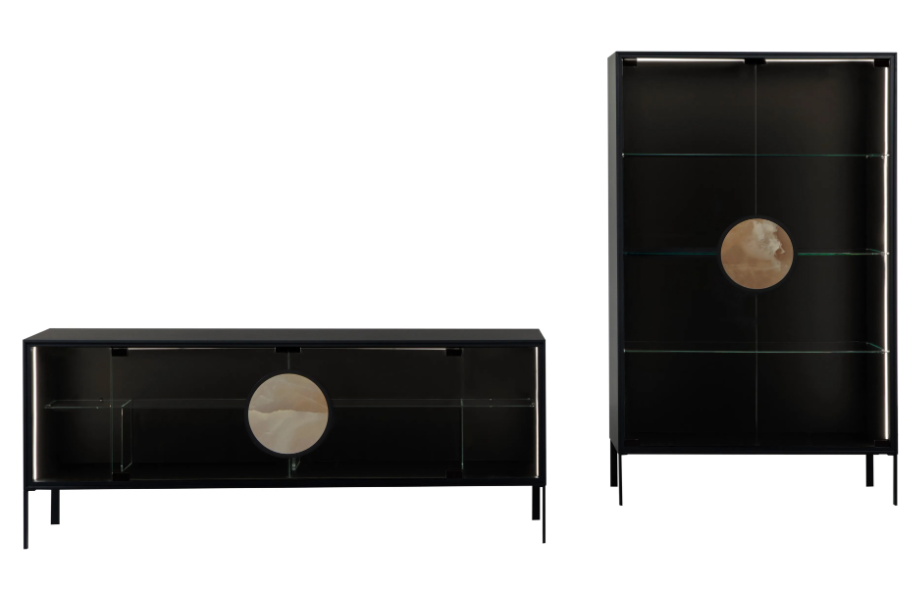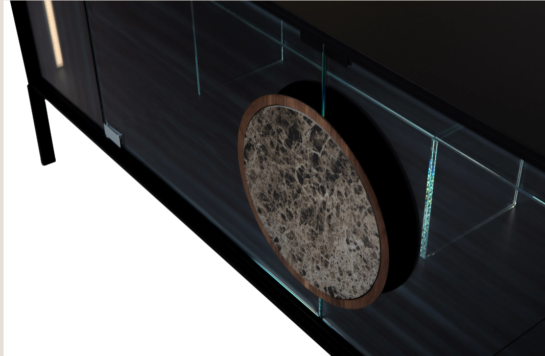 Dot este un bufet minimal șic, cu o formă ușoară și un caracter puternic, care își ia locul în medii atemporale. Design și detalii: un cerc perfect care acționează ca un mâner din lemn sau gresie porțelană îi îmbunătățește estetica cu ușile din sticlă transparentă sau fumurii.