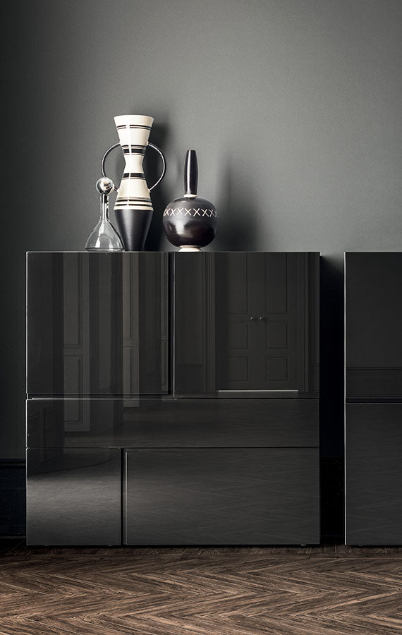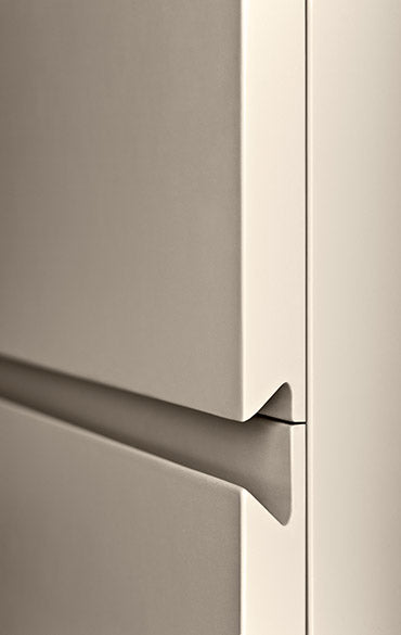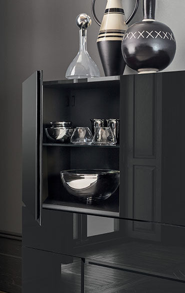 Formele și suprafețele reduse pentru un aspect curat suprem, colțurile pătrate ascuțite și funcționalitatea supremă sunt trăsăturile distinctive ale bufetului Quadra, a cărui trăsătură remarcabilă este modelul mânerelor realizate cu experiență de pe uși, sculptate din lemn masiv.