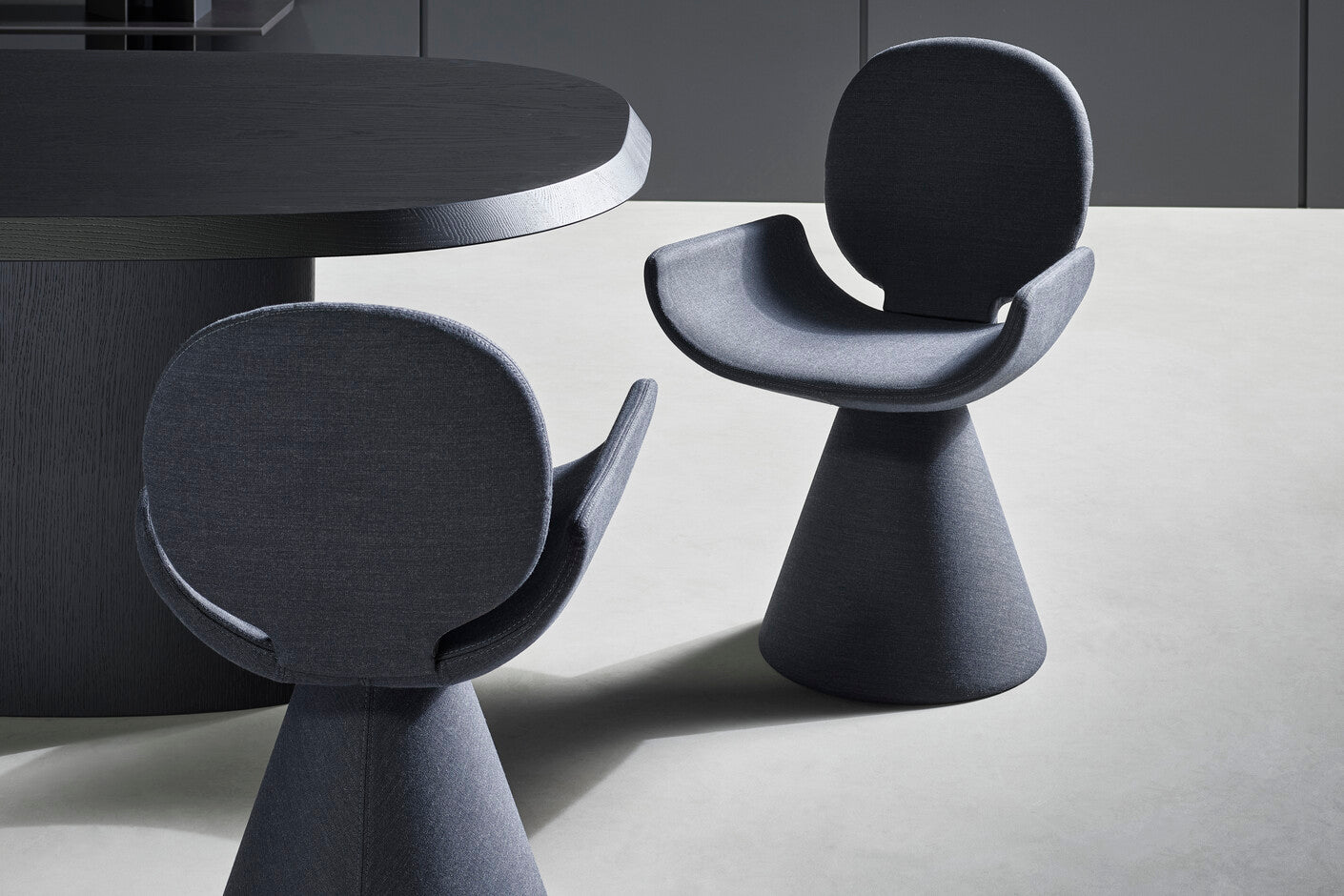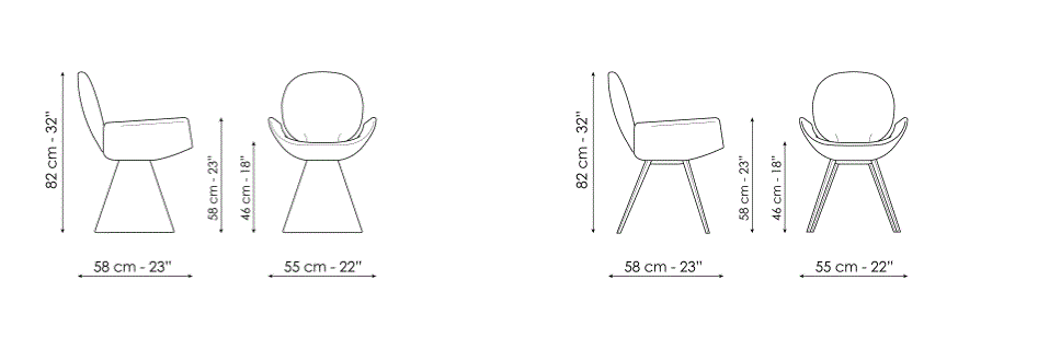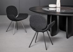 diferite forme care se combină pentru a crea un ansamblu armonios datorită tapiterie din stofa sau piele care o acoperă complet: spătarul circular se varsă în scaunul mare și întregul este susținut de o bază conică evazata. Youpi este disponibil și cu patru picioare metalice.