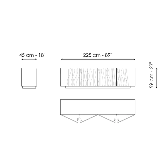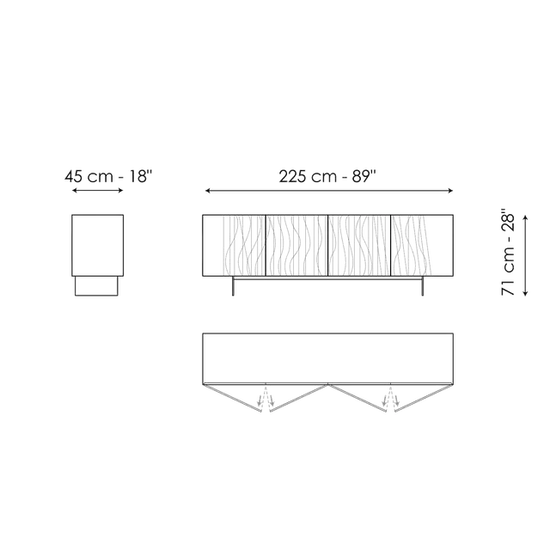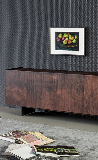 Esențială prin forma și aspectul său, accentuate de designul bazei cu lame duble, bufetul modern din lemn Blush surprinde privitorii datorită stilului secțiunii frontale, marcată de urme brazdate în ușor relief, care dau impresia de „vibrație”. Liniile drepte și curbe ale modelului abstract, care se succed într-un ritm variabil, oglindesc și în același timp subliniază fibra naturală a lemnului, sporind diferitele nuanțe tonale și profunzimile clarobscurului într-un „truc” perceptiv dezvăluit de numele accesoriului : această decorațiune estetică subtilă face ca bufetul să apară într-o culoare roșu închis.