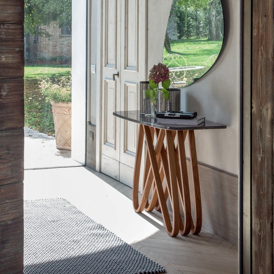 Baza curbată din lemn Arpa și stilul său rotund sunt posibil și mai evidente în această versiune de consolă. Culorile clasice ale lemnului Tonin Casa – nuc Canaletto, stejar închis la culoare și alb mat – se întâlnesc cu blaturi din sticlă extra-albă. Există, de asemenea, versiuni de marmură, fie cu marmură albă lucioasă de Carrara, fie cu marmură neagră lucioasă Marquinia.