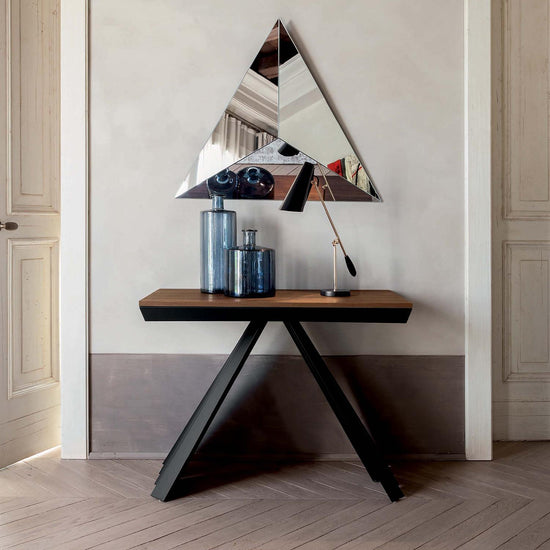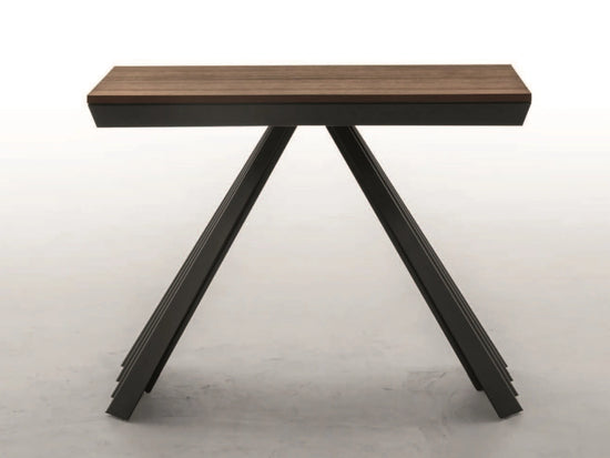 Ventaglio este o masă consolă extensibilă, care poate deveni o masă destul de mare. Baza metalica lacuita este perfecta pentru blaturile acoperite cu lemn. Bazele alb mat, negru mat sau bronz piatră se potrivesc perfect cu nucul Canaletto, stejarul întunecat în relief și blaturile alb mat.