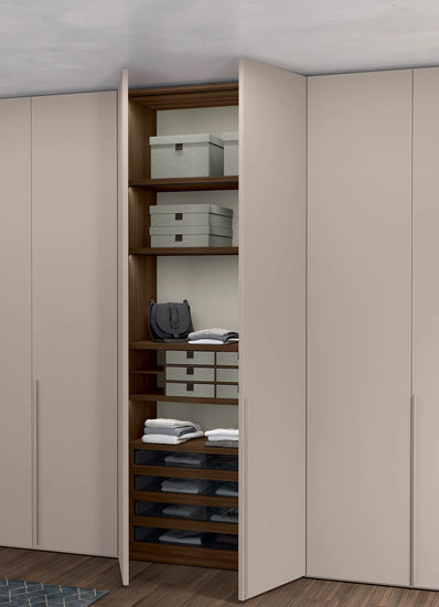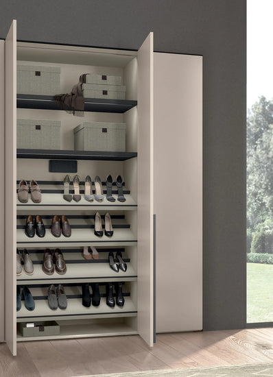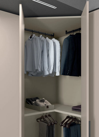 Fiind modular el poate fi adaptat pe dimensiunea dorita si accesorizat dupa preferinte. Putem adauga iluminare cu led, sau alte accesorii pentru depozitare, cum ar fi bari de umerase pentru pantaloni, bari de umerase rabatabile pentru compozitiile mai inalte, sau polite pentru pantofi.