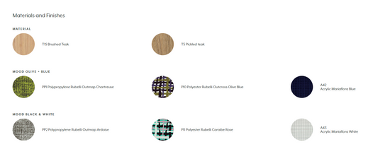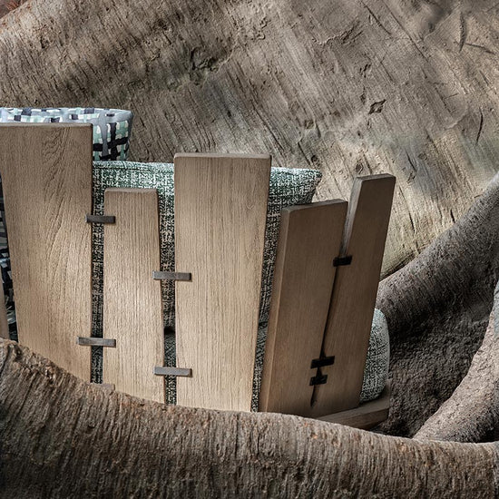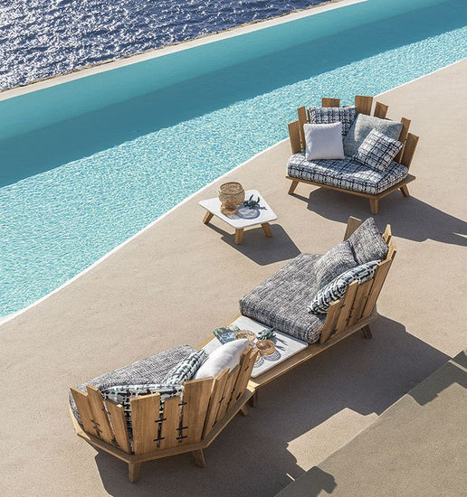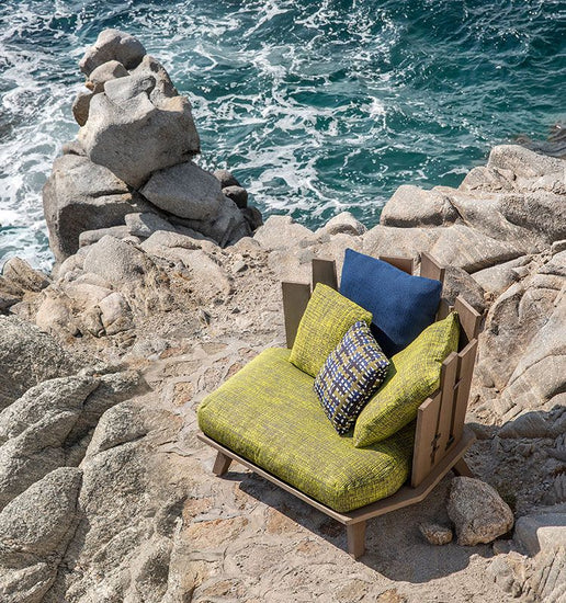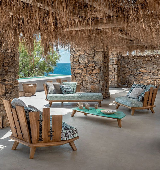 Rafael este o colecție cu un aspect neobișnuit și un caracter puternic, influențată de versatilitatea și efemeritatea naturii. Structura robustă din tec periat, cu capse metalice care adaugă o notă de măiestrie, se întâlnește cu texturile și nuanțele pernelor, într-un dialog compozițional în care se inserează mesele din marmură albă sau piatră glazurată în culoarea mării. Lucrările artizanale ale lemnului de tec, marmură și piatră de lavă se combină de fapt cu gama sofisticată de culori textile, din nou proiectate de Paola Navone, care îmbunătățesc mobilierul căptușit.