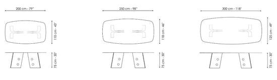 cele două picioare care formează baza sunt realizate dintr-o pereche de benzi de sticlă care se extind spre exterior, formând un unghi care conferă stabilitate mesei.