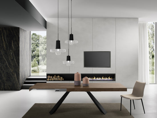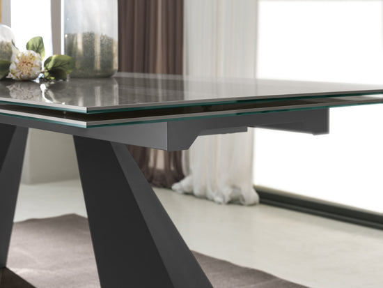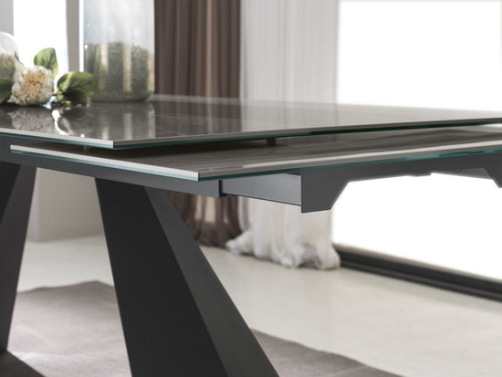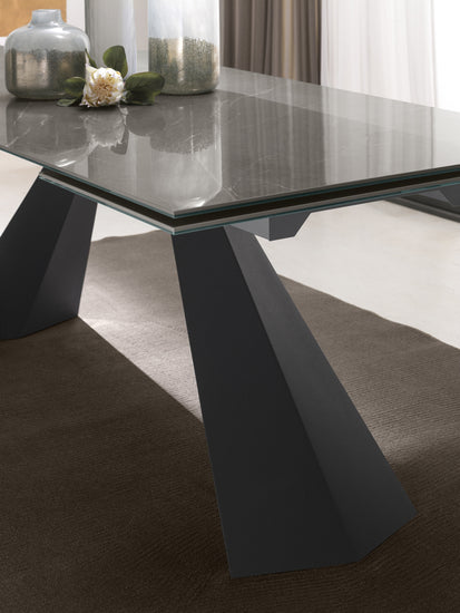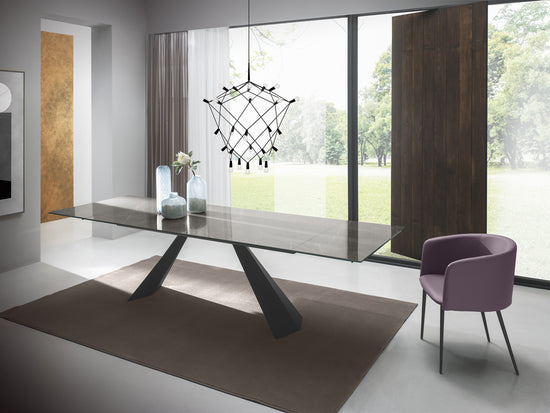 Masa fixa sau extensibila, cu baza metalica vopsita si blat disponibil in diferite finisaje si dimensiuni, atat in varianta extensibila cat si in cea fixa.