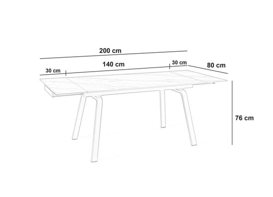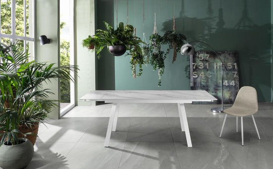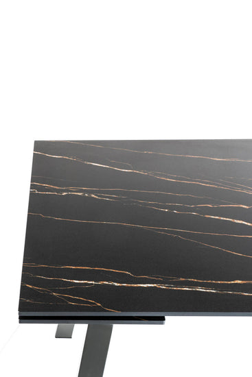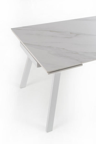 Masa de dining extensibila, cu finisaje ce imita marmura in douna nuante .