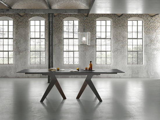 Masa fixa sau extensibila cu picioare din metal vopsit si lemn masiv, blat disponibil in diferite finisaje si dimensiuni, atat in varianta extensibila cat si in cea fixa.