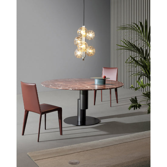 Baza mesei rotunde Innesti, proiectata de Paolo Grasselli pentru Bonaldo, apare desprinsa din partea superioară, ca și cum partea superioară ar fi suspendată în aer. Cele două părți sunt unite printr-o îmbinare perfectă, dar neașteptată care pune această masă în centrul atenției cu un mare efect sculptural. Acest element devine caracteristica remarcabilă a zonei de zi, în timp ce dialogheaza cu spațiul înconjurător datorită este posibil sa personalizați detaliile cu diferite tipuri de marmură, lemn și ceramica pentru blat si diferite metale pentru baza.