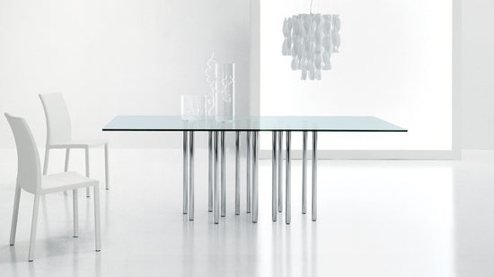 Un design conceput pentru a mobila și caracteriza spațiile, datorită transparenței blatului de sticlă combinată cu numeroase picioare din oțel, elemente tubulare subțiri cromate care variază ca număr și poziție, în funcție de dimensiuni si forma blatului, pentru a asigura stabilitate maxima si coerență vizuală. Mille este o masă fixă care pare să posede totul
