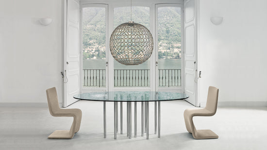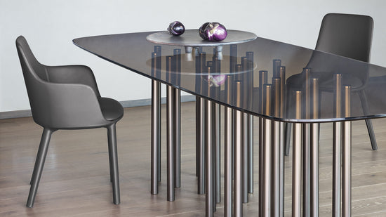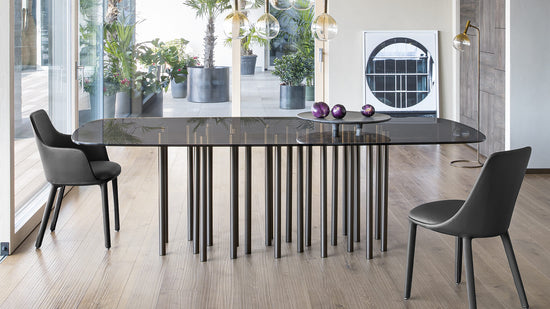armonia și dinamismul unui corp transparent în mișcare. Potrivit pentru locuințe private și contexte contractuale, este disponibil cu blat rotund, pătrat sau oval și în multe dimensiuni în pentru a satisface toate nevoile de ospitalitate. În formă dreptunghiulară, Mille poate fi realizat și cu blat din sticlă sau ceramică tratată cu acid si picioare din metal vopsit sau cu cupru mat, alama mat sau finisaje cromate.