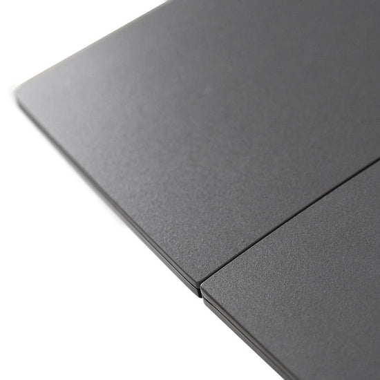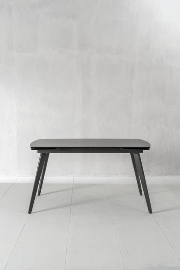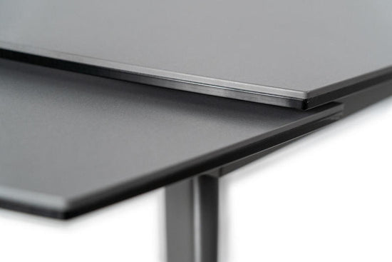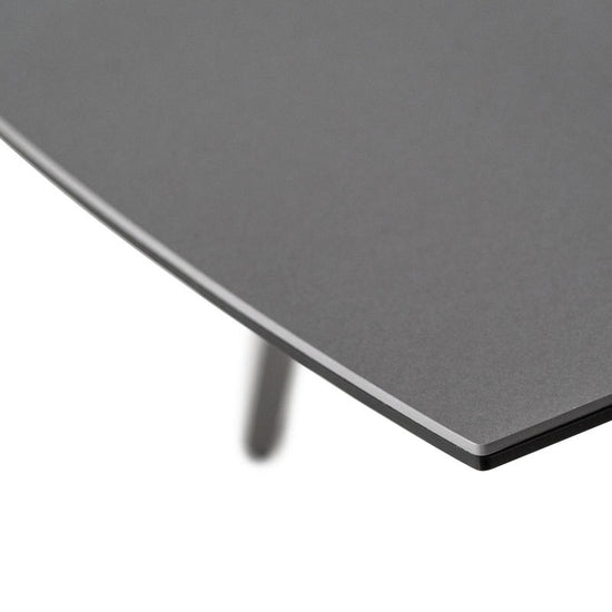 Masa de dining cu design modern, simplu cu blat subtire, gri antracit si picioare de metal vopsite.