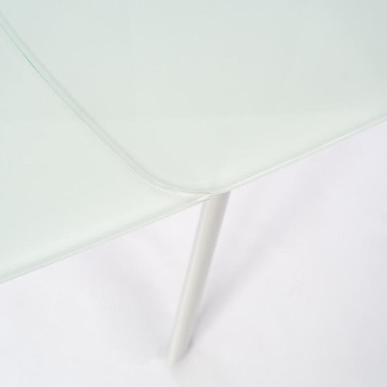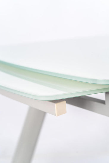 Masa de dining extensibila, cu blat din sticla alba si picioare din metal vopsite.