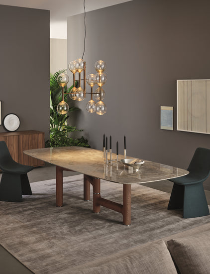 Masa Pivot își ia numele de la forma neobișnuită a bazei: piciorul central actioneaza ca pivot pentru cele trei picioare care se extind în lateral. Rezultatul este un asimetric, o combinație extrem de originala. Picioarele sunt realizate din lemn masiv de stejar carbune sau nuc cu insertii de metal, în timp ce blatul este disponibil în marmură, lemn, sticlă și ceramică, în cele două variante rotunde și cu muchii rotunjite.