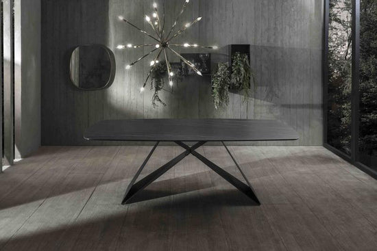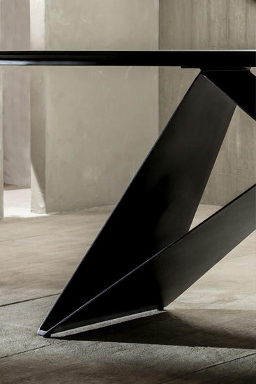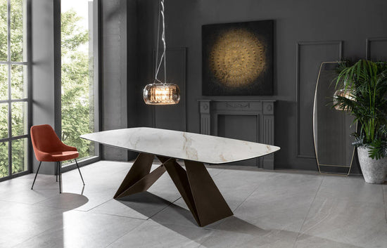 Thanos, masa ceramica pe sticla securizata, suprafata foarte interesanta cu efect portoro si totodata structura unica din metal vopsit ce lasa imaginatiei libera exprimare, mare si confortabila pentru cina cu prietenii si rudele.