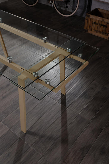 Masa de bucatarie extensibila moderna, cu blat din sticla transparenta si picioare de metal vopsite.