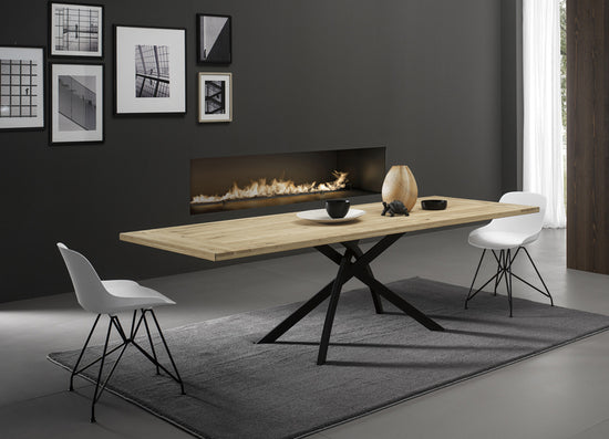 Masa fixa sau extensibila cu baza metalica vopsita si blat disponibil in diferite finisaje si dimensiuni, atat in varianta extensibila cat si in cea fixa.