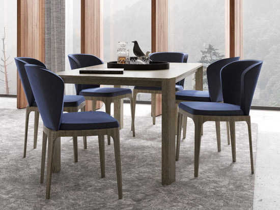 Masa din lemn extensibila cu picioare din lemn masiv caracterizata prin croiala trapezoidala si blat din lemn neted in acelasi finisaj ca si piciorul.