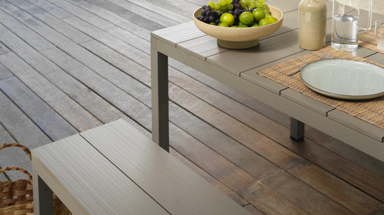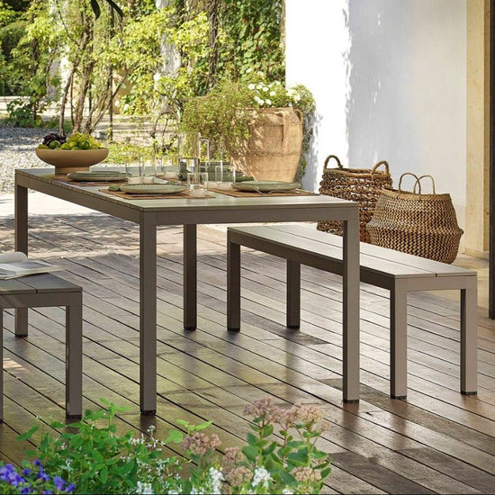 Un set convivial și versatil format dintr-o masă Rio Alu 210 Fix și două bănci Rio Bench Alu, ambele din aluminiu acoperit și cu blaturi șipci și linii perfect elegante.