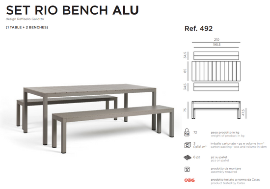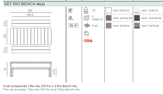 Setul include 1 Rio Alu 210 Fix (masa fixa 210 x 85 x 75h cm) si 2 Rio Bench Alu (banca). Material: cadru și blat din aluminiu acoperit. Picioare reglabile pe inaltime.