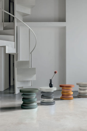 Măsuța de cafea ideală, cu un design tânăr și versatil, pentru orice idee de mobilier: modelată de o mulțime de blaturi rotunde de diferite dimensiuni și culori, așezate una peste alta, poate deveni punctul forte care adaugă caracter camerei.