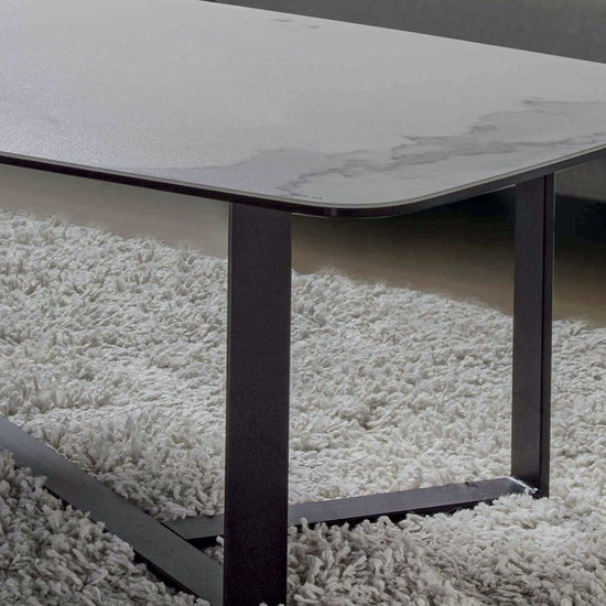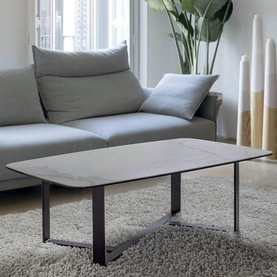 Masuta de cafea cu un blat deosebit din ceramica ce imita marmura si picioare din metal vopsite.