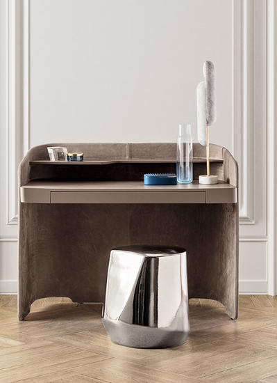 Haik se prezintă ca un amestec armonios de forme geometrice, capabil să reflecte și să se joace cu lumina superbelor sale finisaje metalice, dar și să se potrivească cu hotărâre în zonele esențiale în varianta de culoare albă. Măiestria procesului de fabricație face ca fiecare piesă să fie unică. La vedere sau la atingere sunt percepute de fapt calitatea implementarii sale si naturaletea materialului. Puterea inovatoare a acestui obiect la constructie, forma, material si finisaj, il face o piesa de mobilier distincta, potrivita pentru orice mediu din interiorul si exteriorul locuintei. Eclectic în interpretarea sa poate fi folosit ca noptiera, masuta de cafea, taburet. În toate împrejurările, este un unic, de recunoscut, o notă de artă care nu poate fi ignorată.