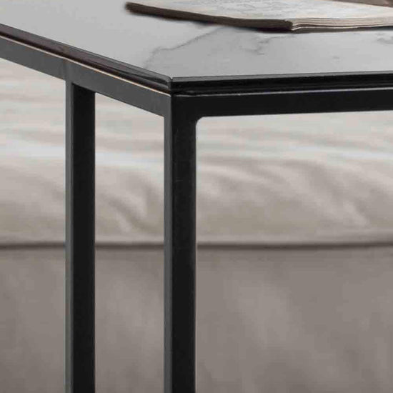 Masuta de cafea cu design modern, minimalist. Blatul este din ceramica si imita marmura alba, iar suportul este metalic vopsit mat.