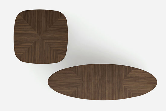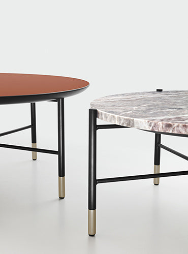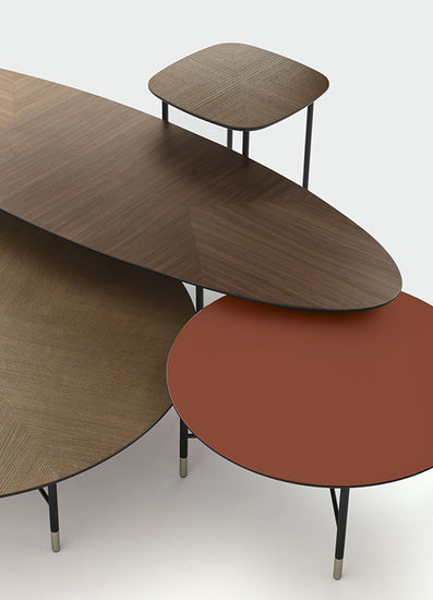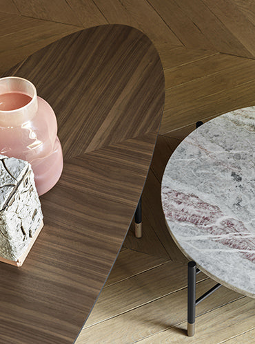 Masute de cafea de diferite inaltimi si dimensiuni, unite printr-o structura rafinata si detalii rafinate. Mambo este o colecție mare și versatilă, care vine în diferite soluții, perfectă pentru a fi folosită în fața canapelei, consolei sau măsuței. Sfaturile cu finisaj contrastant fluidizează și caracterizează picioarele tubulare ale bazei, în timp ce o articulație mică distinge intersecția tubularelor în crucea inferioară. Blatul, disponibil in diverse marimi si forme - patrat, eliptic sau rotund - poate fi realizat cu finisaj lemn cu incrustatie sau marmura, lucrat pentru a obtine o suprafata orizontala mata si lucioasa pe laterale, sau furnir de lemn cu frezare pe MDF negru. Colectia este completata de un puf circular, disponibil in doua marimi, cu o perna cu margini grosgrain.