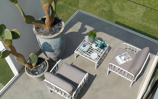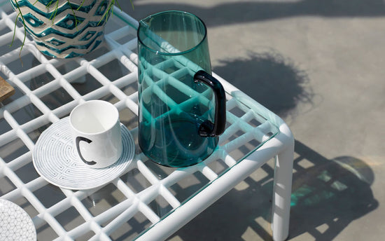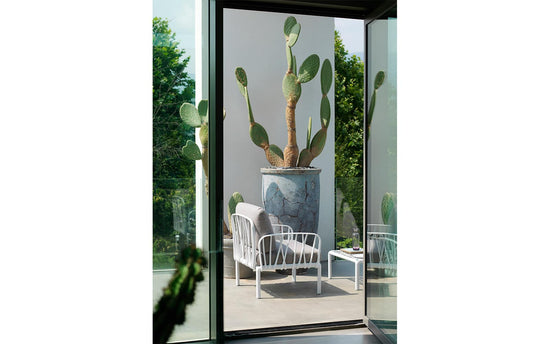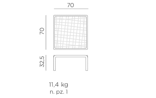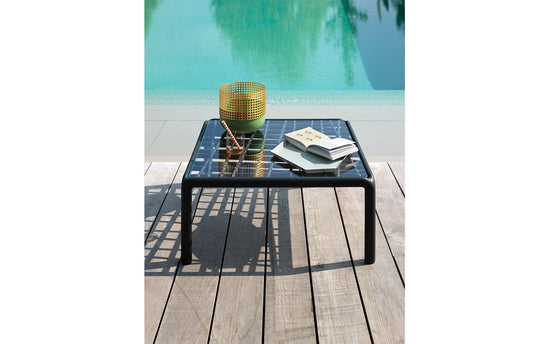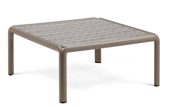 Element din colecția de scaune modulare de mobilier de exterior Komodo. Este o masă laterală mare și funcțională, disponibilă cu blat din rășină din sticlă sau fibră de sticlă. Disponibil și separat.