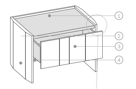 Panouri din aglomerate acoperite cu melamina din clasa Carb2 cu conținut scăzut de formaldehidă. Fundul este întotdeauna ridicat de la sol cu 180 mm iar sertarele au sistem de inchidere "soft closing".