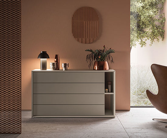 Caracterizată prin panouri mdf de 22 mm grosime prelucrate cu dublă înclinare la 45° în două directii. Panourile se înfășoară în exterior în jurul fronturilor sertarelor.