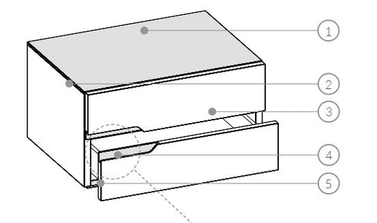 Mânerul unității este frezat pe fața sertarului creând o formă moale trapezoidală.