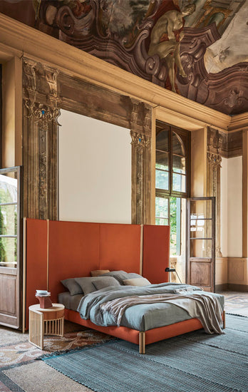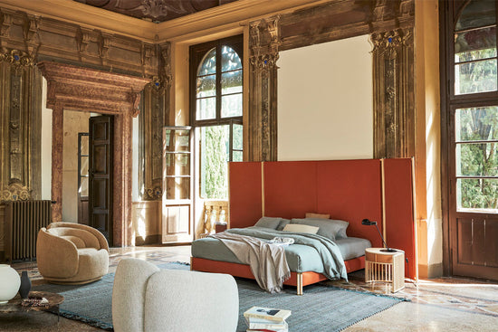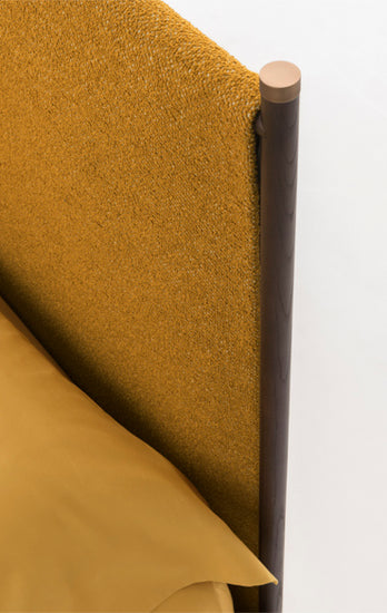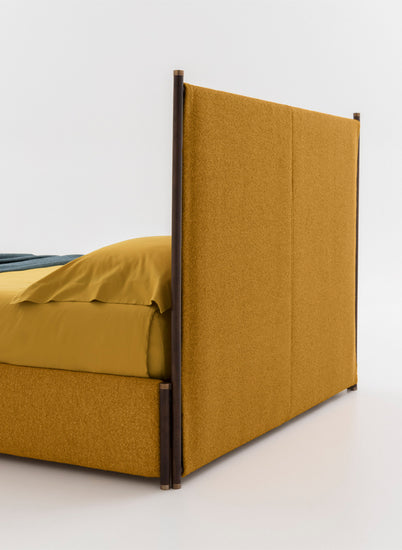 Rigoare formală și linii elegante. Structura lui acest pat, compus din montanti din lemn cu vârfuri metalice, evocă bricolele lagunei venețiane: delimitează spațiul, îi asigură coordonatele. Tablia patului este, de asemenea, unică: un panou din material textil