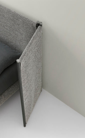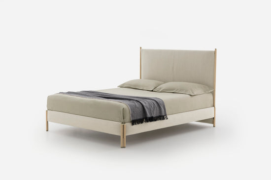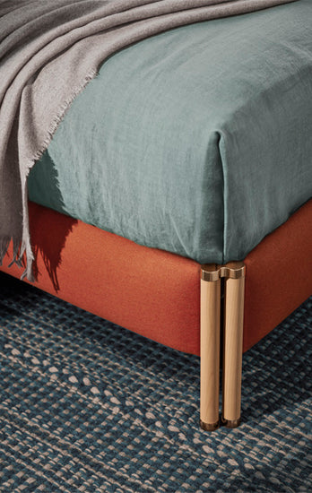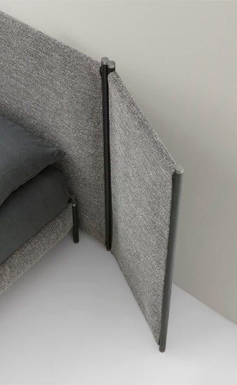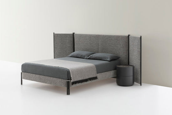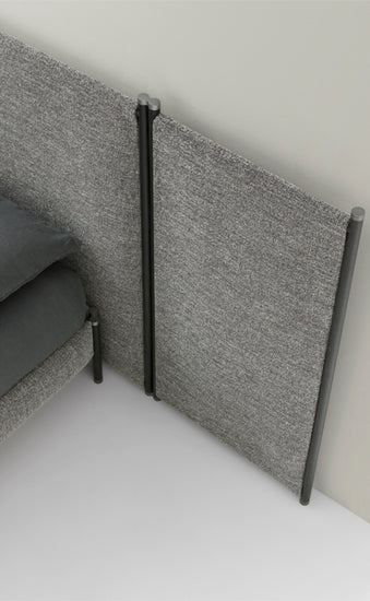 2 — Pat Bricola cu cadru de pat din material textil Pasca 52, picioare de frasin negru, vârfuri metalice titan mat.