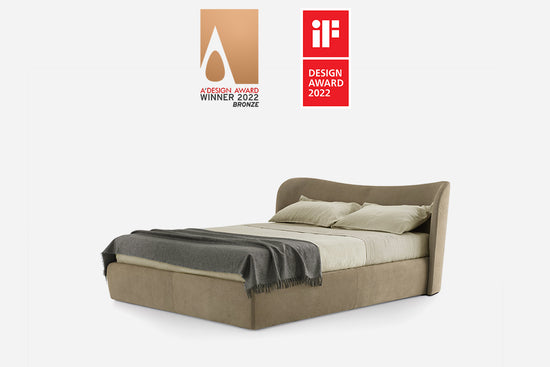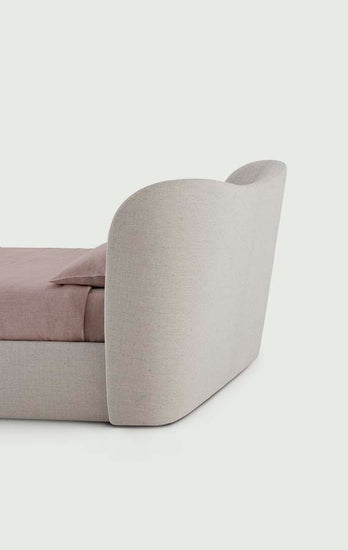 Formele sale de inspirație clasică sunt liniștitoare solemne, distincte, dar și primitoare. Simplitatea rafinată a patului de îmbrățișare răsună căldura unei îmbrățișări, o retragere către un refugiu sigur. Caracteristica dominantă a patului, headboard -ul curbat, coconii corpul principal al patului într -o îmbrățișare primitoare, materială, oferind umeri de protecție, liniștitor. Versiunea fără un container de depozitare subdispotrivă poate găzdui o saltea încastrată. Picioarele ascunse ridică structura la câțiva centimetri de podea într -un aspect delicat, aproape indiscutabil al plutitorului.