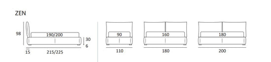Pat matrimonial Zen cu design modern, spatarul este format din doua perne mari, moi si pufoase. Este in totalitate dehusabil in variantele cu tesatura si ecopiele. Se poate spala foarte usor, structura este din pal si somiera din lemn stratificat.