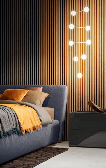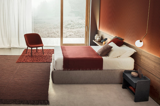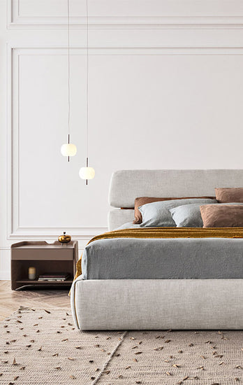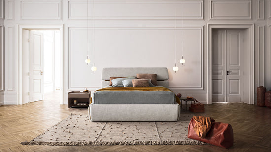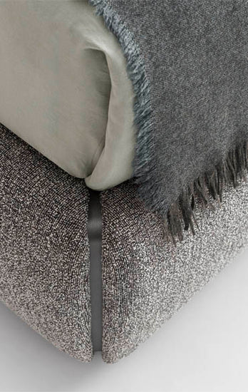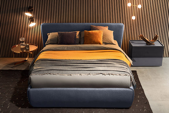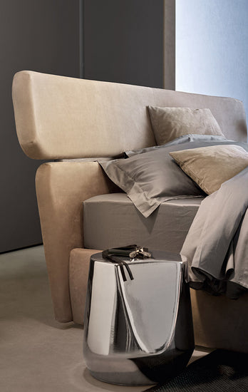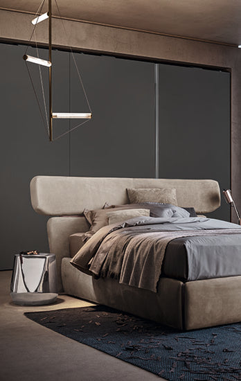 Îndrăzneala și spiritul inovator fac un design cu o personalitate modulară. Formele îndrăznețe, moderne, atenuate de marginile rotunjite, sunt întrerupte de distanțiere foarte decorative disponibile în lemn sau cu finisaj lăcuit sau metalic. Există trei opțiuni de design pentru tăblia: joasă pentru versiunea Base, înaltă cu un panou dublu trapezoidal pentru modelul Rialto Diritto și impunătoare și curbată pentru versiunea Large. Întregul cadru este căptușit și tapițat cu material detașabil, piele sau piele artificială.
