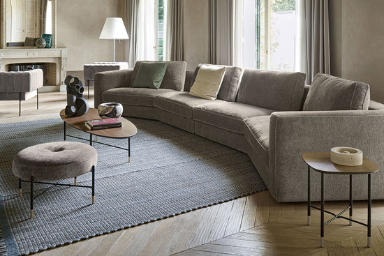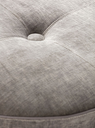 Pouf Mambo din material Velvet 14 cu profil Gros Grain col.46, stofa Bellis 35 cu profil Gros Grain cu 94, Țesătură Dalia 06 cu profil Gros Grain col 45. Structura lacuita neagra mat cu vârfuri de șampanie mate.