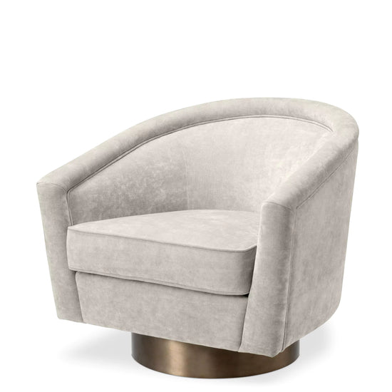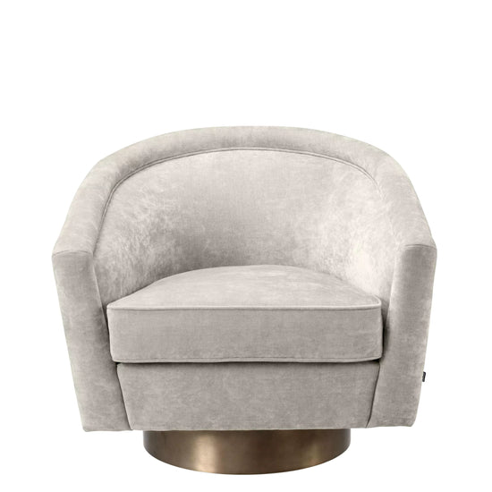 Relaxați-vă la maxim în elegantul scaun rotativ Catene. Un design contemporan cu note de fler retro caracterizează acest frumos scaun tip butoi care se sprijină pe o bază pivotantă aurie mat pentru o notă modernă. Tapițeria gri Clarck conferă acestei piese de mobilier un aspect somptuos.Disponibil si in varianta Clarck nisipiu.