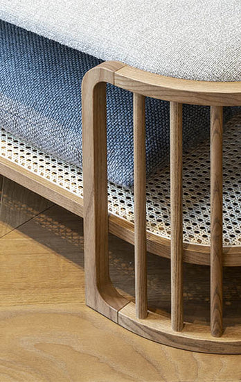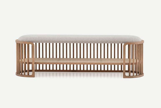Foșnetul stufului răsună în această colecție versatilă și contemporană. Efectul liniar al spațiilor pline și goale creează un aspect armonios, liniștitor și adesign delicat. O serie de secțiuni rotunde din lemn definesc structura noptiera si banca, infasurandu-se si oferind sprijin celor suspendati volumele suprafetelor orizontale.Banca are o sezut tapitat.