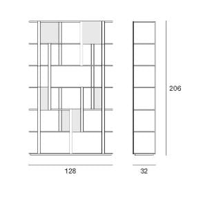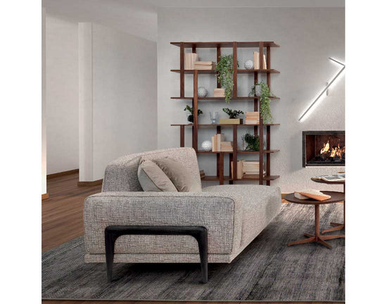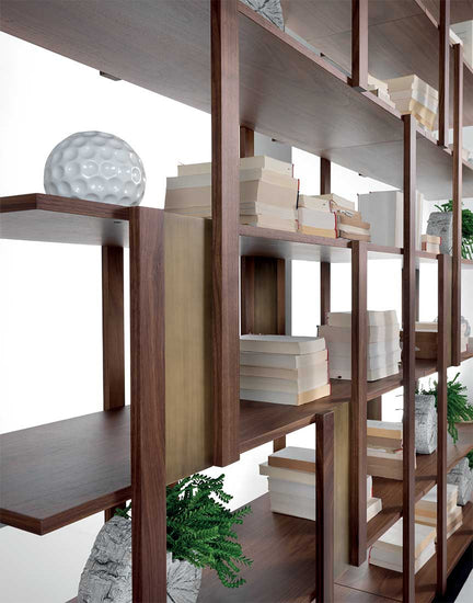 Bibliotecă de sine stătătoare și modulară cu structură și rafturi din nuc canaletto. La cerere, inserții din metal vopsit titan, bronz sau alamă patinata.