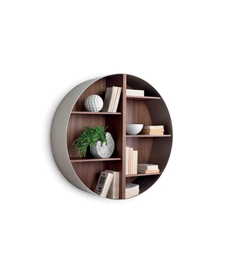 TAO - Bibliotecă cu structură metalică vopsită de culoarea ardeziei. Spătar, separatoare și rafturi furniruite în nuc canaletto.