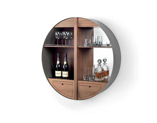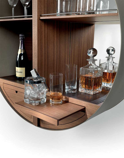 TAO BAR - Dulap bar cu structura metalica vopsita de culoarea ardeziei. Spătar, separatoare și sertare din nuc canaletto. Oglinda dreapta jos. Rafturi din lemn cu inserție din piele.