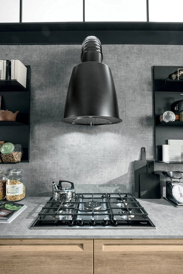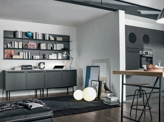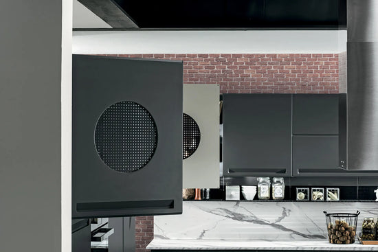 O piesă de mobilier coerentă care oferă elemente deschise coordonate cu finisajul Carbone al hubloului cu textură perforată.